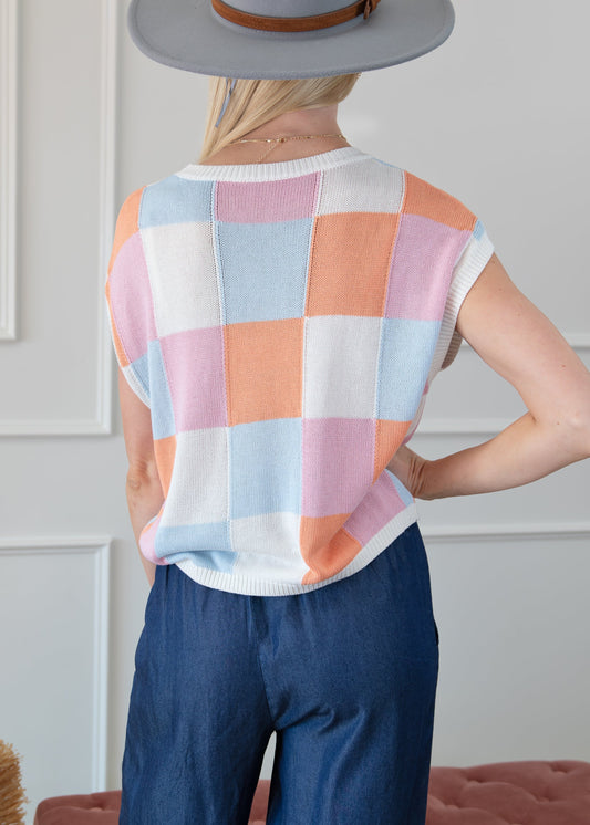 Checkered Color Block Cap Sleeve Sweater