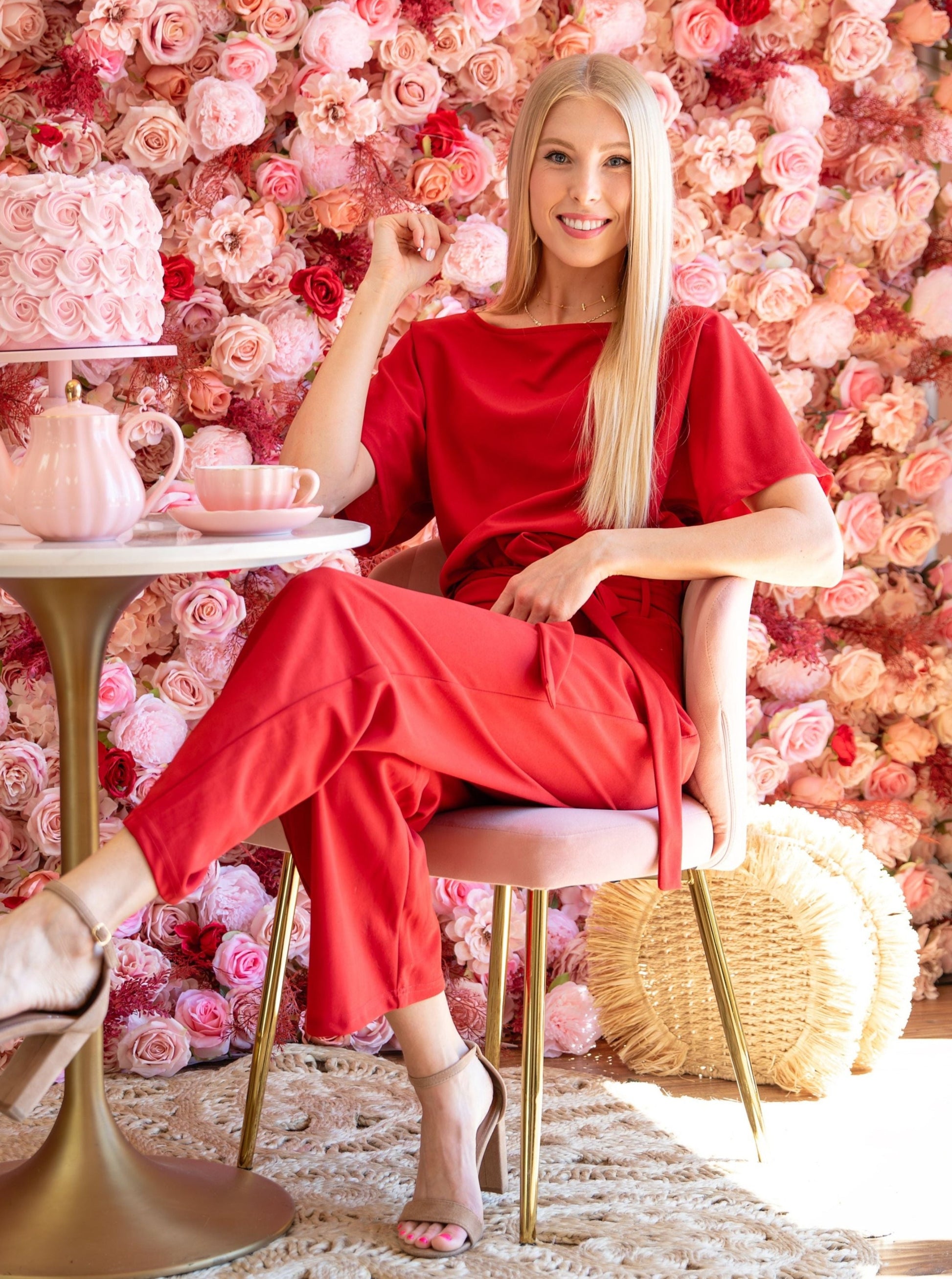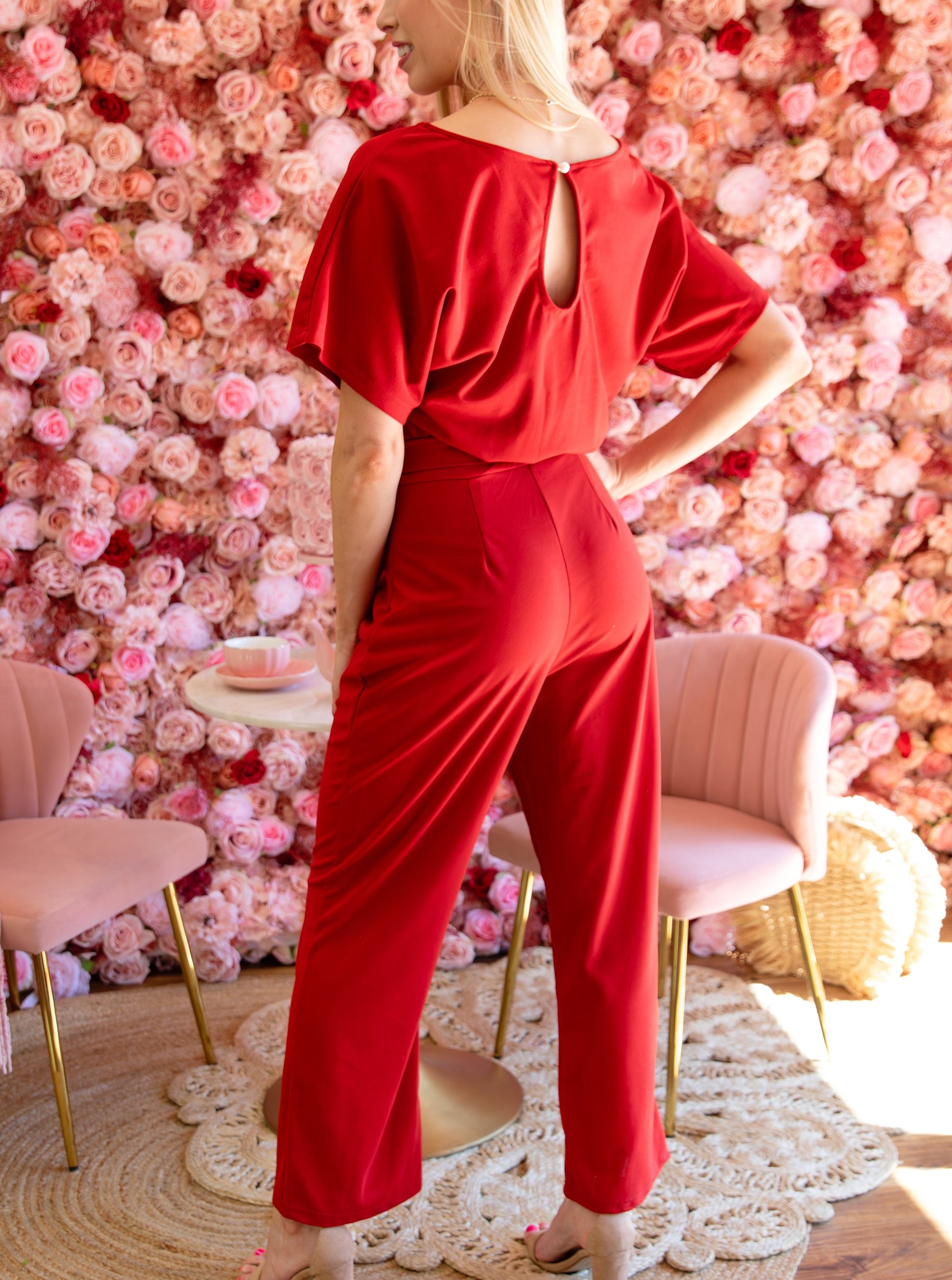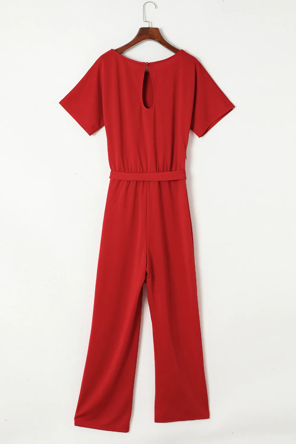 Achieve a glamorous look with this monochrome jumpsuit that exudes sophistication. Crafted from a comfortable stretch fabric, it offers a friendly and cozy fit. The women's jumpsuit is adorned with a tie waist belt, batwing sleeves, and wide legs, adding a stylish flair to your ensemble. Complete the stunning look by pairing it with subtle heels and a touch of red lipstick.