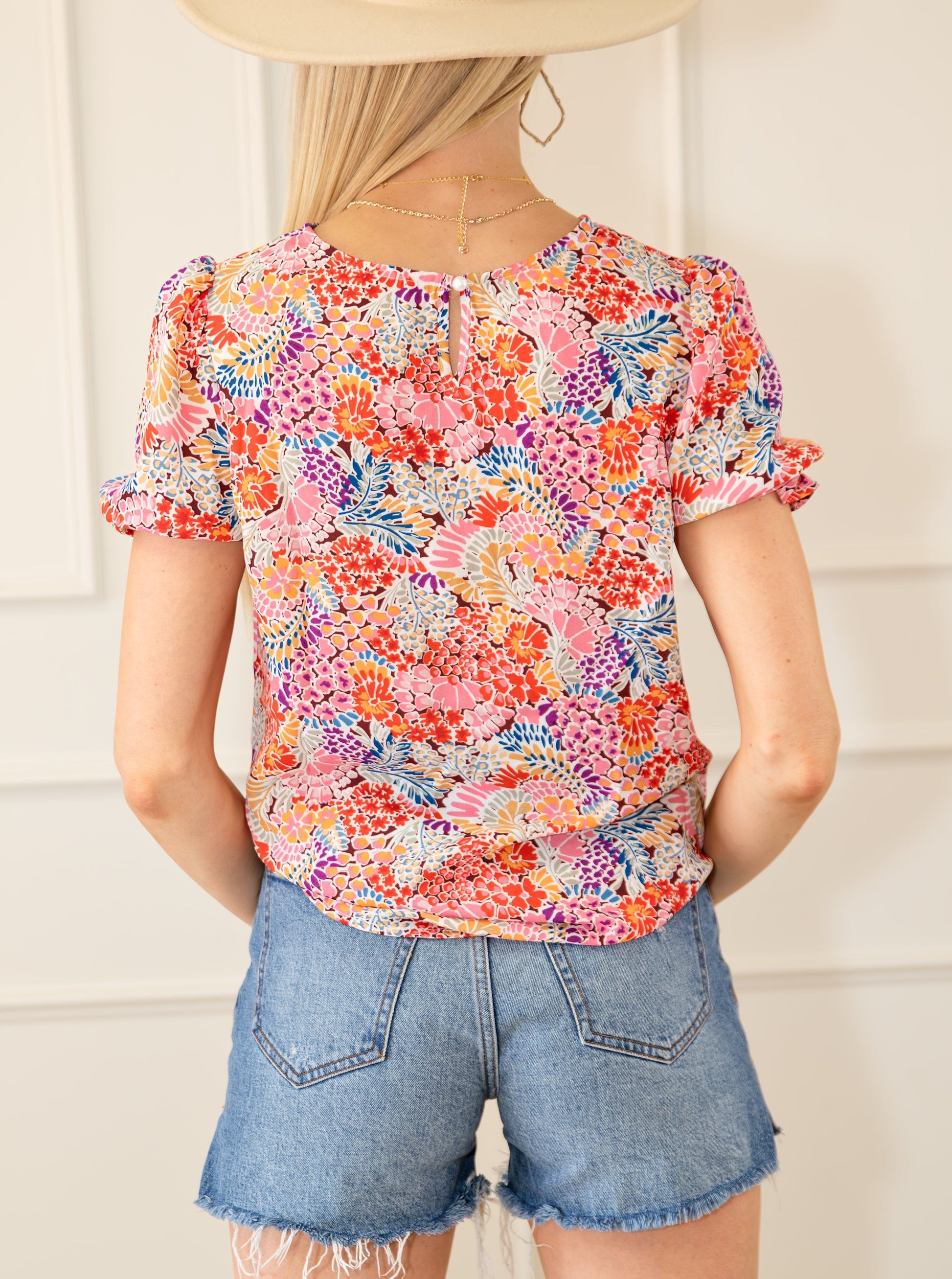 Check out our Bubble Sleeve Blouse! It has colorful flower designs that will grab people's attention and give you a fashionable look. The blouse is made from soft and light materials, so it feels comfy. The bubble sleeves make it a bit puffy and keep the overall style laid-back. You can wear this printed blouse for casual events or dress it up for fancier occasions.