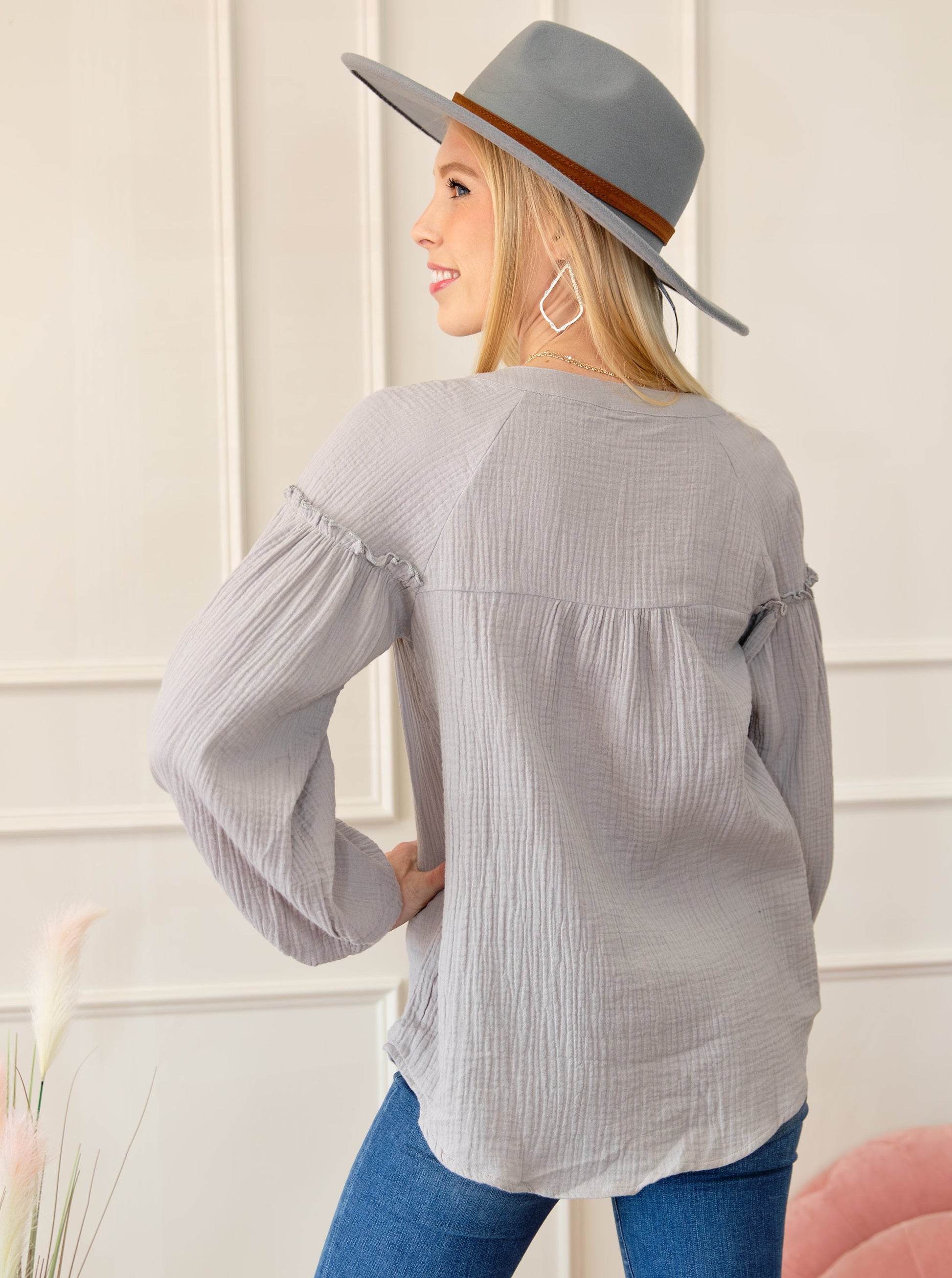This comfortable and relaxed blouse is perfect for achieving a petite look. Crafted from stylish textured fabric, it features a split neckline and front snap button closures. The blouse is completed with balloon sleeves and raw edges, creating a chic and laid-back vibe. Pair this women's blouse with jeans and sneakers for a trendy ensemble.