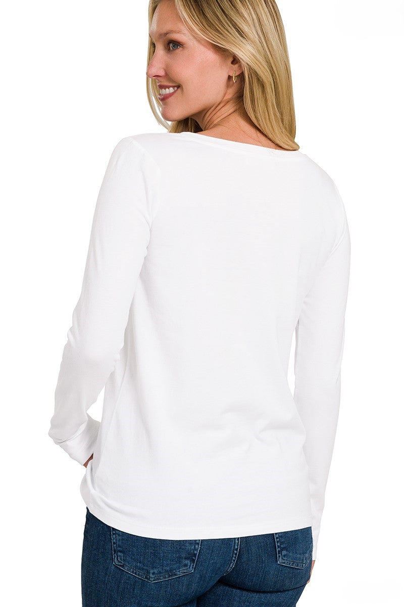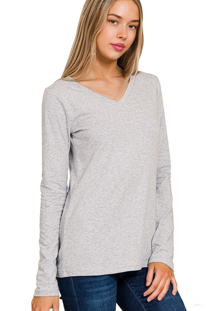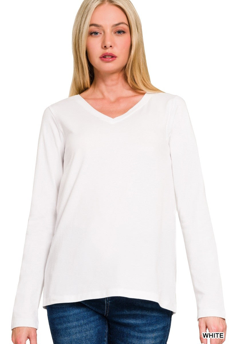 Nothing better than a quality cotton basic tee! This top features v-neck style and long sleeves.