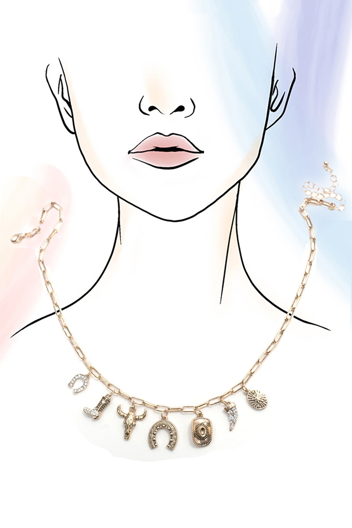Saddle up in style with this bold and rustic necklace featuring iconic symbols of the Wild West: a horseshoe, cowgirl boot, hat, and bull head, on a rugged link chain. Whether layered or worn solo, it adds the perfect touch of country edge to any outfit.