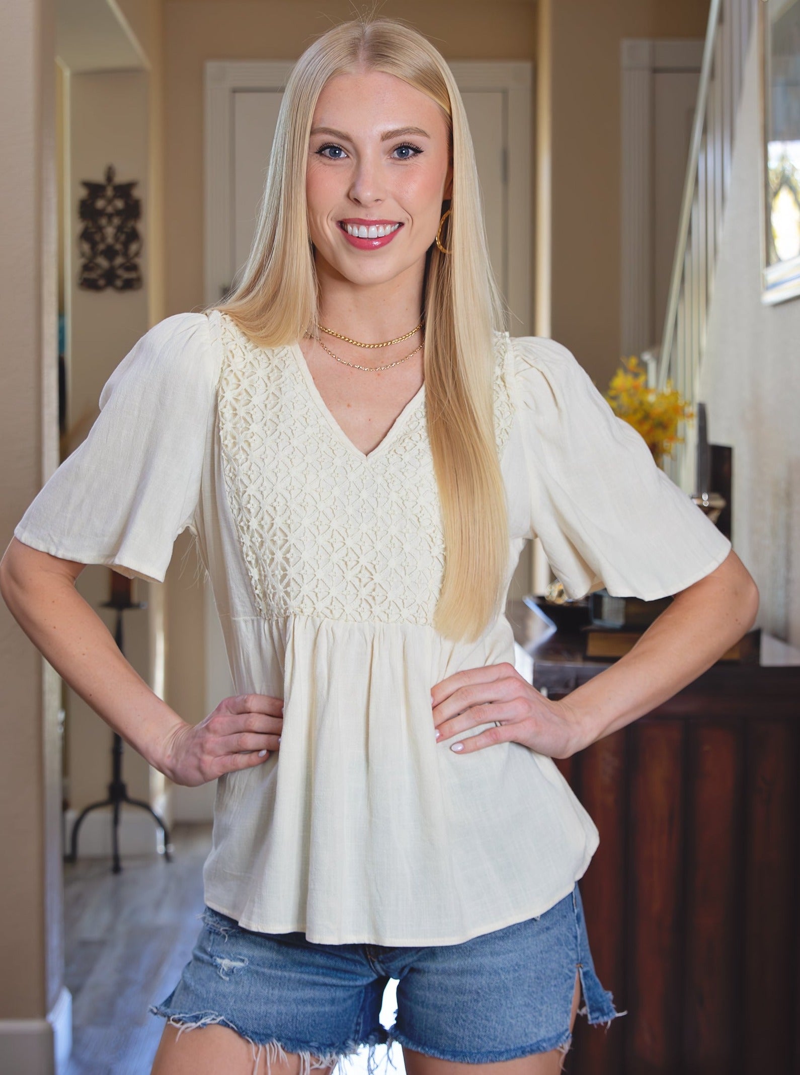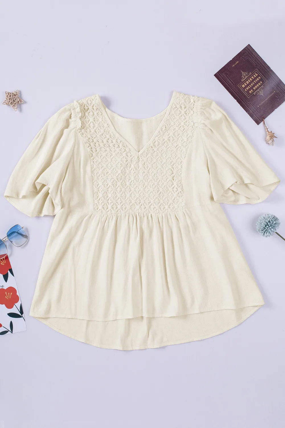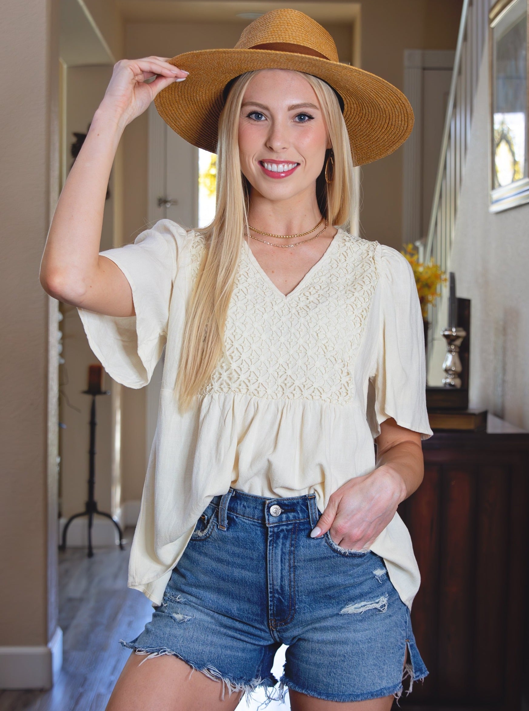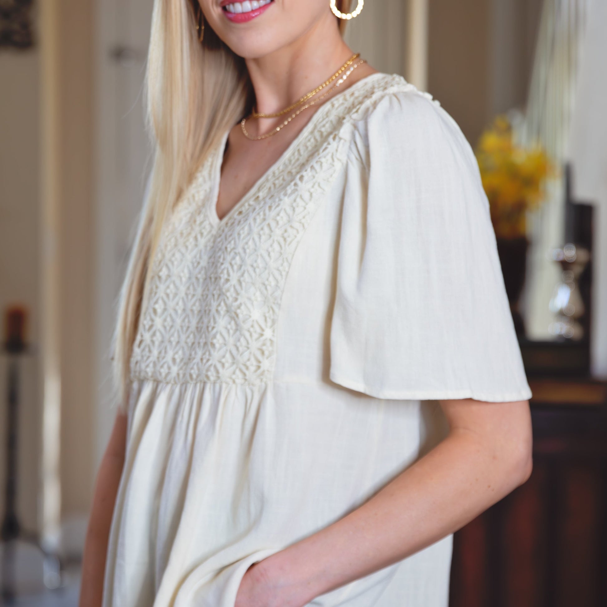 Achieve a laid-back boho style effortlessly with our V-Neck Crochet Detail Babydoll Top. This charming top showcases a V-neckline, short dolman flutter sleeves, a delicately crafted crochet lace bodice, and a high-low hem. Its elegance and flattering design make it a perfect match for jeans, shorts, or fitted pants. Wear this blouse confidently to exude grace and charm in any crowd.