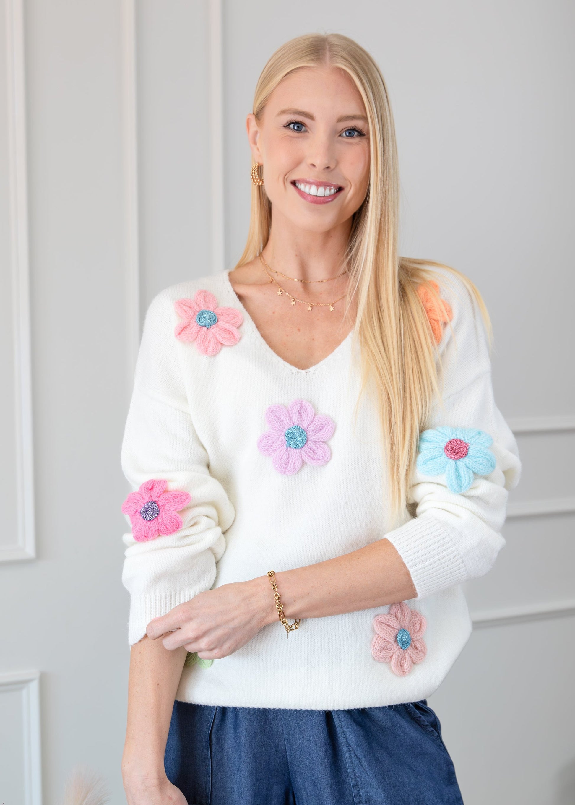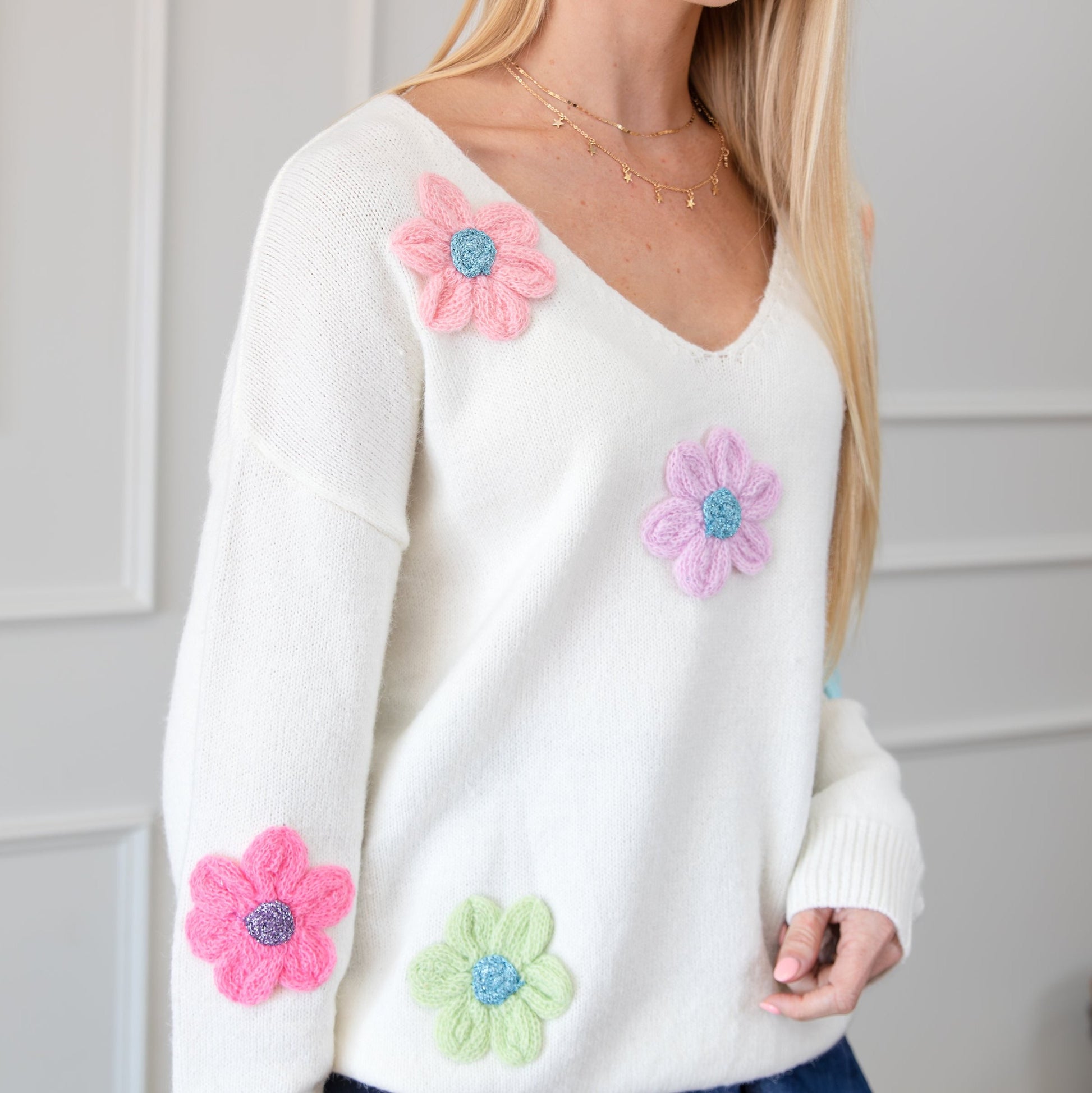 Add a touch of charm to your wardrobe with our Crochet Flower V Neck Sweater. The vibrant white color and delicate crochet flowers make a statement, while the v neck highlights your collarbones and allows you to show off your favorite jewelry. The soft, lightweight knit provides warmth and versatility, pairing perfectly with pants or skirts. Upgrade your style today!