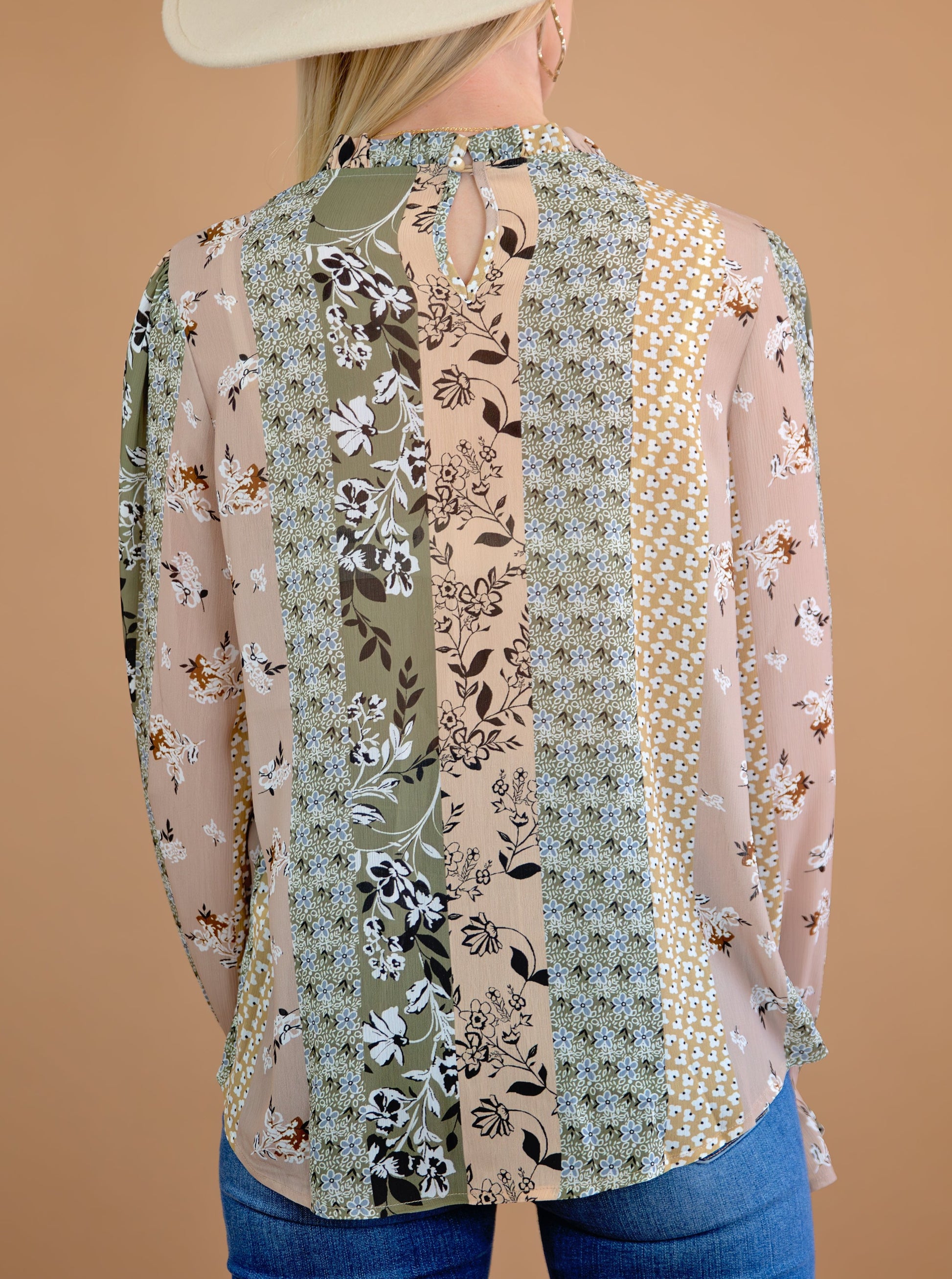 This blouse is gorgeous, elegant, and easy to pair with jeans, skirts, or office pants. It features loose long sleeves with cute ruffled cuffs, a back button closure, a short ruffled neckline, and a gorgeous print.