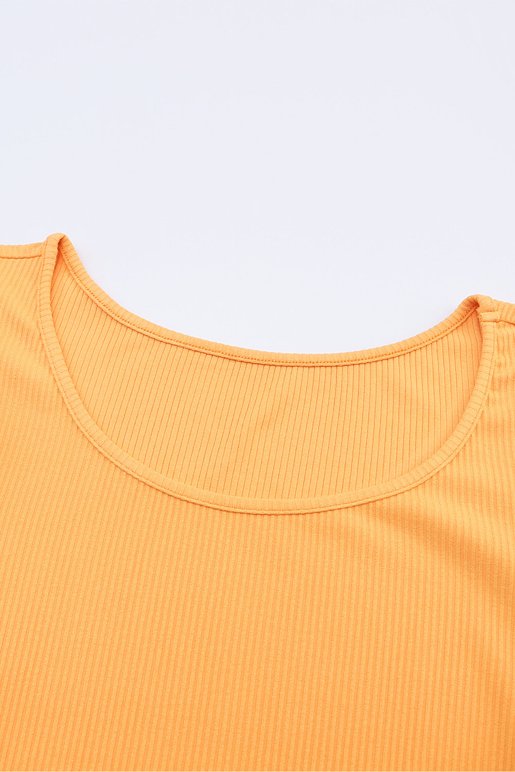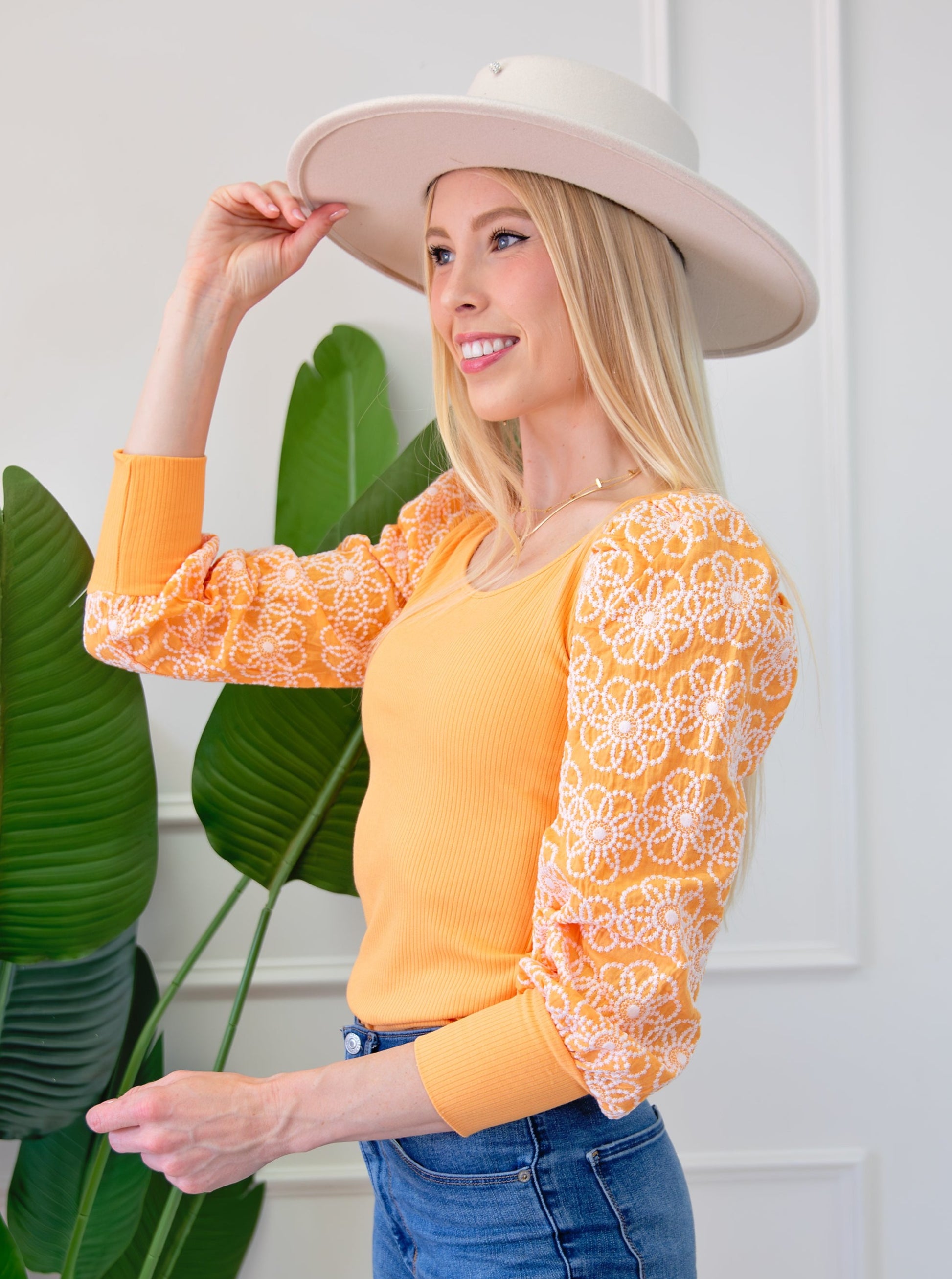 This charming blouse makes a delightful addition to any woman's wardrobe. We adore its U-neck, stretchy ribbed texture, and charming puff sleeves. The lace floral patterns on the sleeves add an elegant touch. Pair it with pants, jeans, or a skirt to complete a stylish outfit.