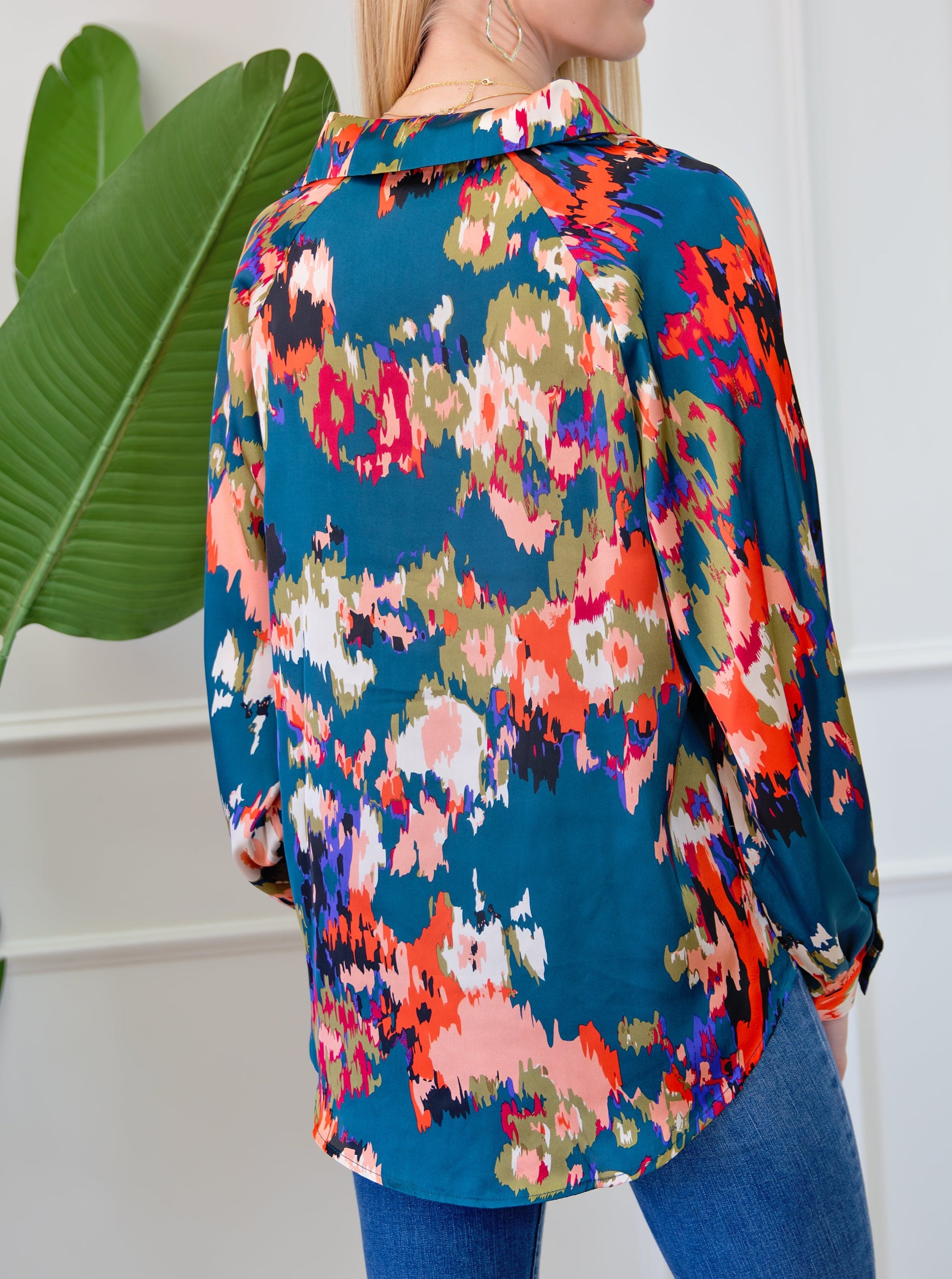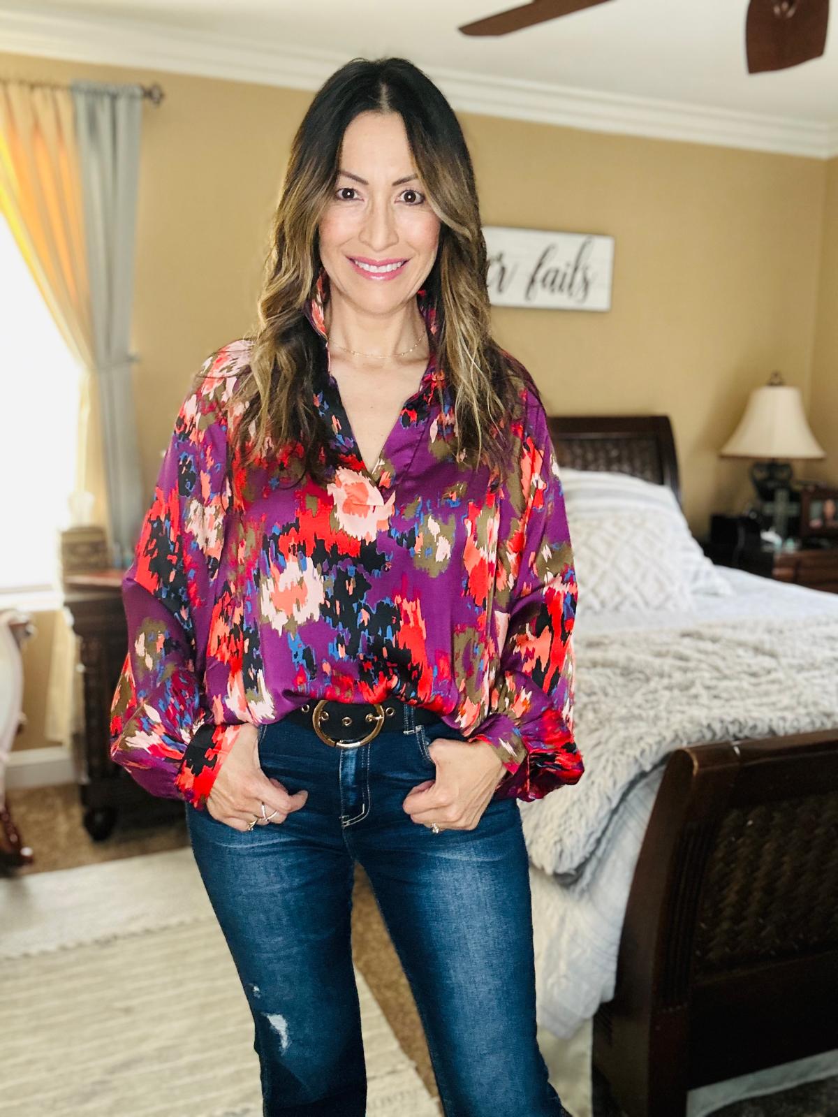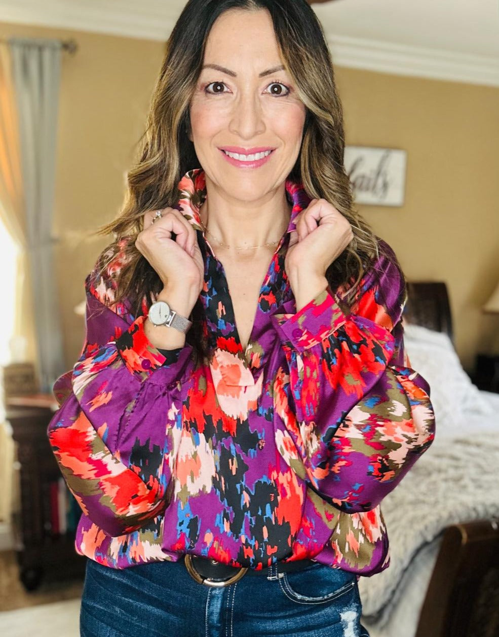 We adore this shirt for its fantastic V-neck and shirt collar, complete with a captivating pattern. The loose cut and oversized, long sleeves that gather at the wrists with a button add to its charm. Feel free to pair it effortlessly with jeans or high-waisted pants.
