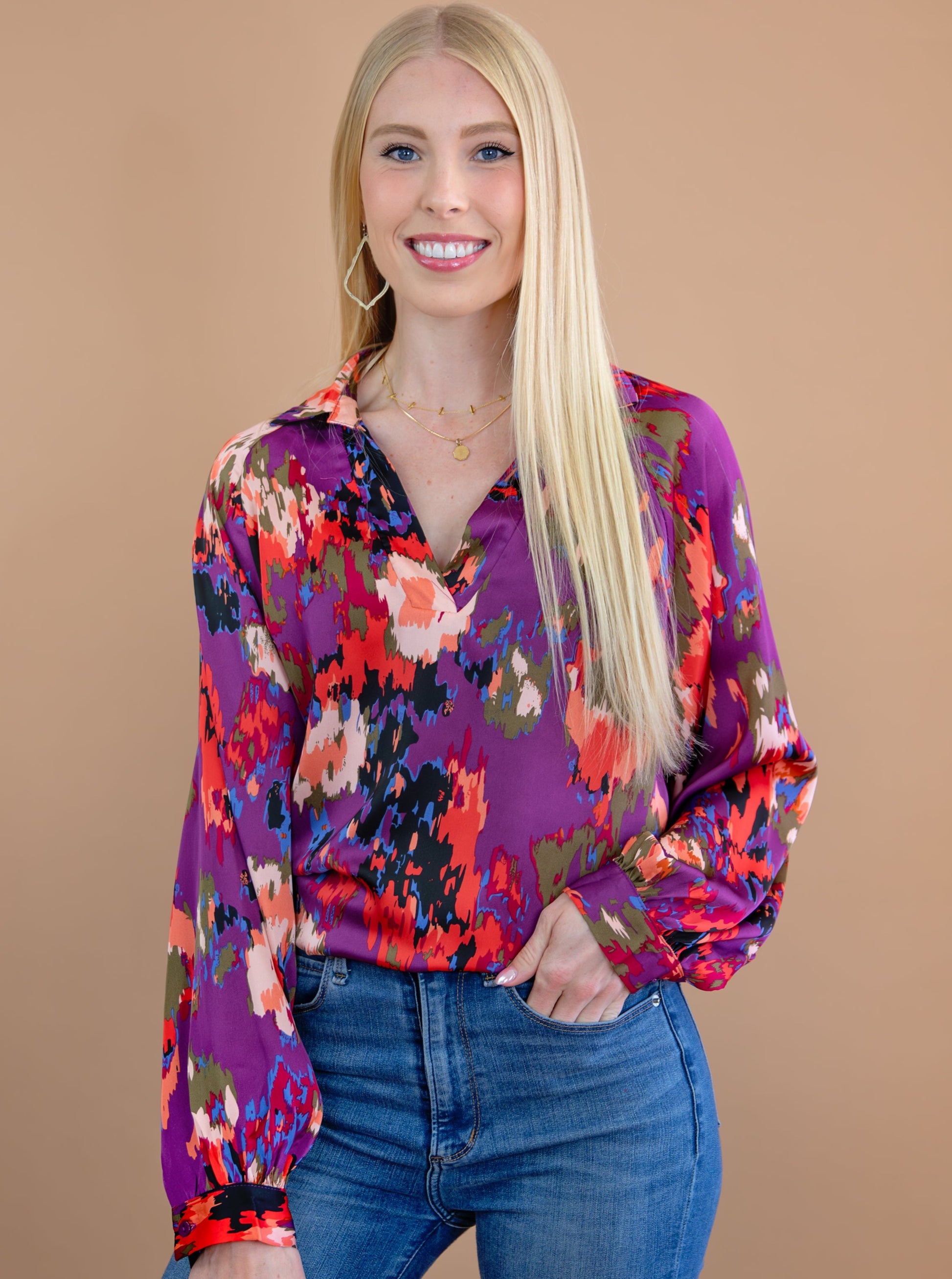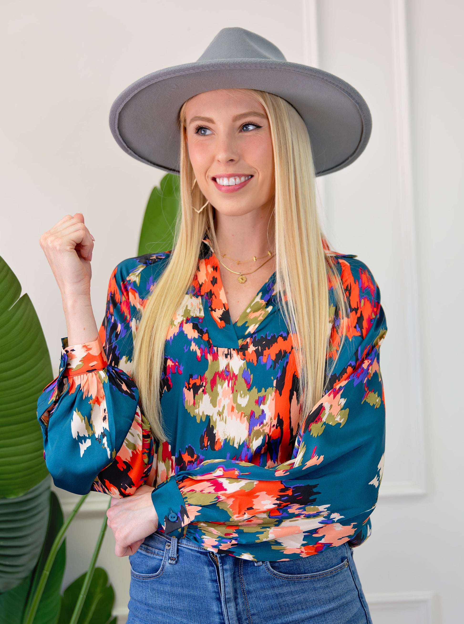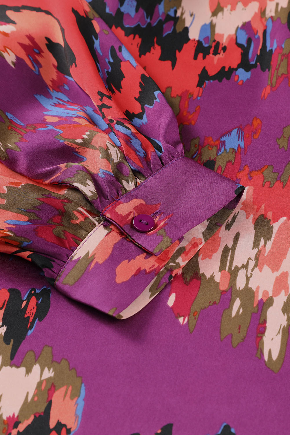 We adore this shirt for its fantastic V-neck and shirt collar, complete with a captivating pattern. The loose cut and oversized, long sleeves that gather at the wrists with a button add to its charm. Feel free to pair it effortlessly with jeans or high-waisted pants.