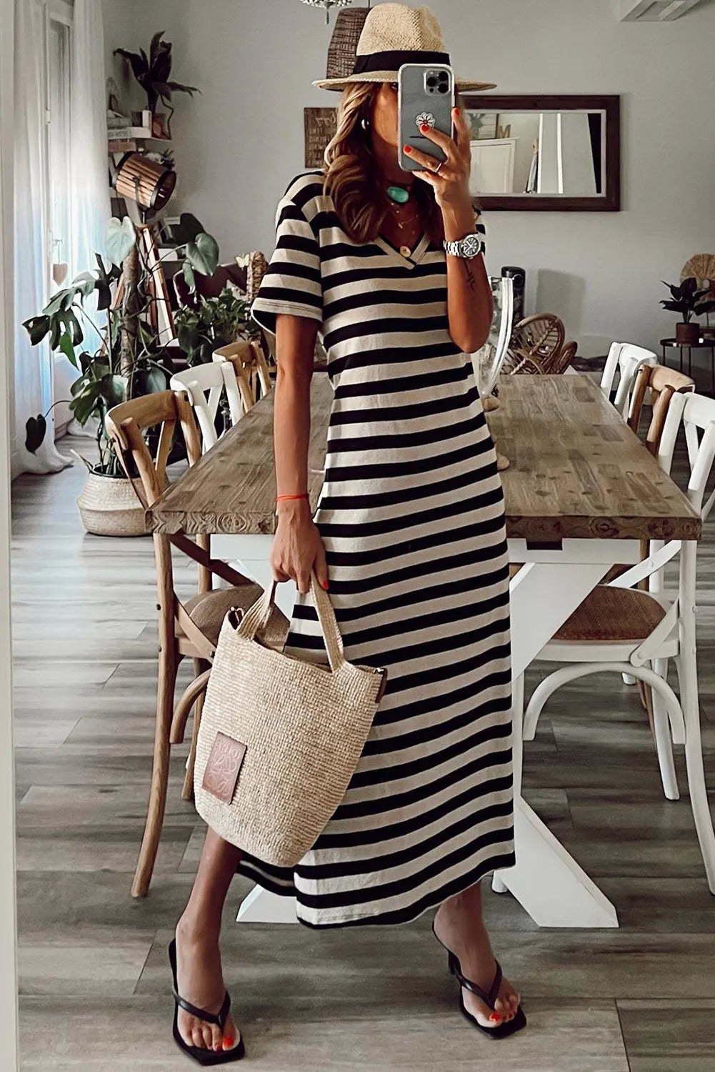 This long dress is more stylish than you might imagine. The timeless striped print ensures that this dress remains timeless. The t-shirt style adds another fashionable element that makes this dress worth having. Turn heads as you confidently walk by in this maxi dress with a striped t-shirt design, leaving onlookers in awe.