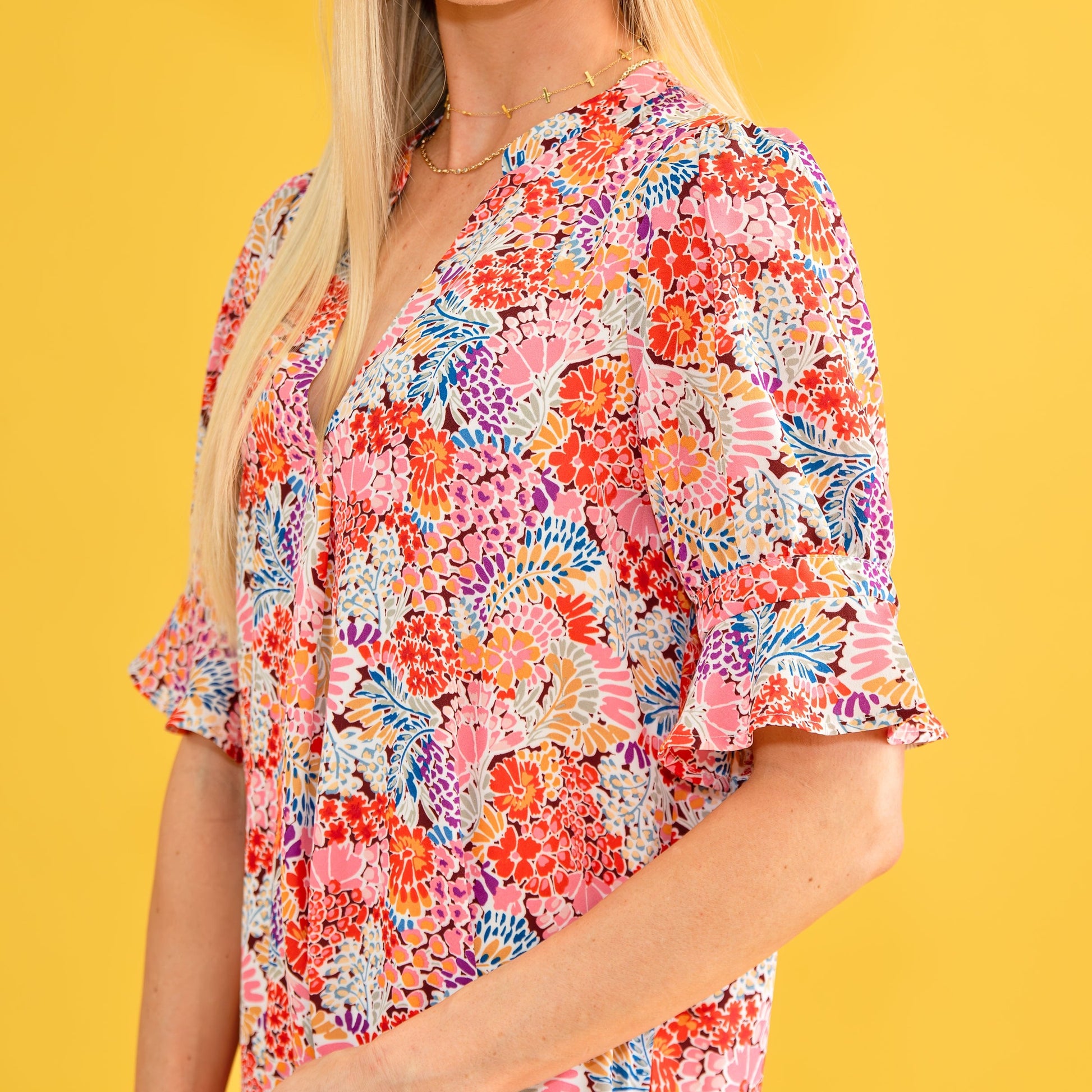 How about we enjoy the summer in this lovely boho mini-dress? It boasts a V-neck, short sleeves, and a graceful, flowing silhouette. The timeless charm of elegant floral patterns and playful ruffled details ensures this dress stays in fashion. Pair it with sandals, high heels, or flats to achieve a charming look.
