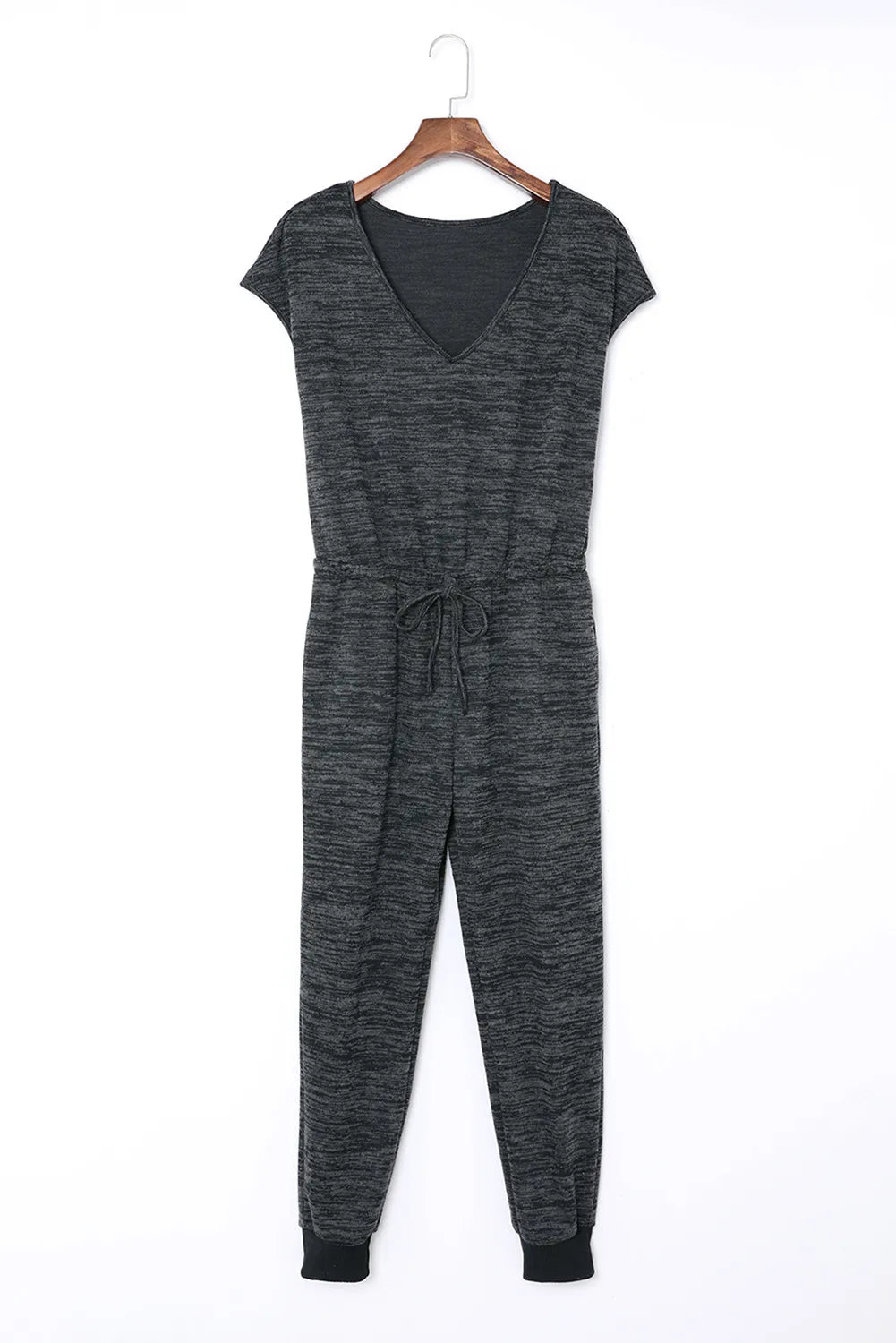 The jumpsuit boasts a stylish and eye-catching heather pattern print, enhancing its overall appeal. Equipped with side pockets, it combines chic aesthetics with practicality, making it a convenient choice for everyday wear. Featuring short sleeves, a v-neck, and a slim-fit design, this jumpsuit is tailored to complement and flatter the feminine figure. The drawstring high waist adds a perfect touch to accentuate women's slender waistlines.