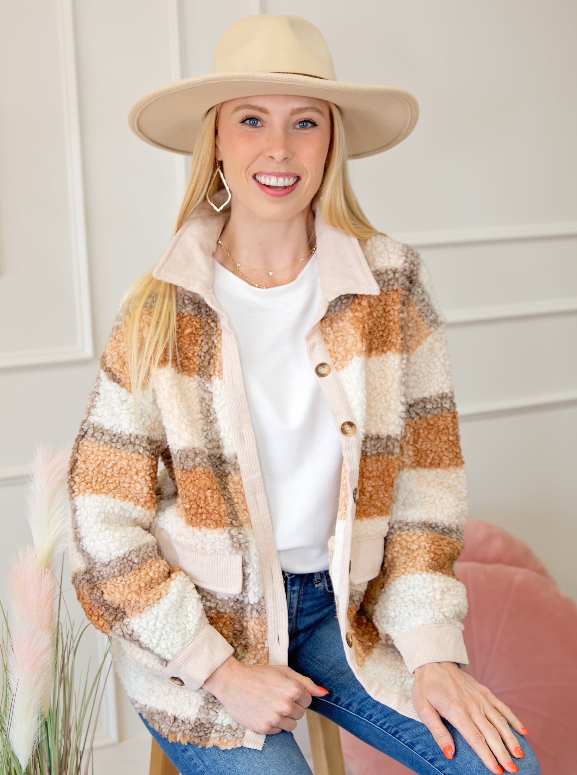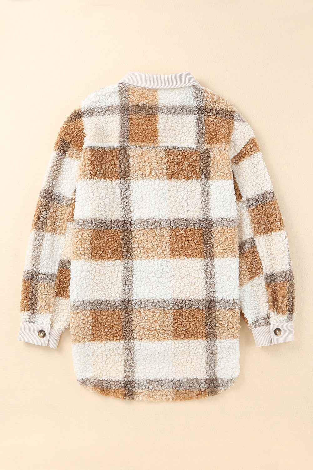 This plaid jacket adds a touch of fashion and casual flair to your everyday attire. The oversized design complements various body shapes, making it a versatile choice for most women. The teddy jacket offers warmth and style, ideal for chilly days. Its unique cut enhances its overall stylish and attention-grabbing appeal. It features big front pockets.