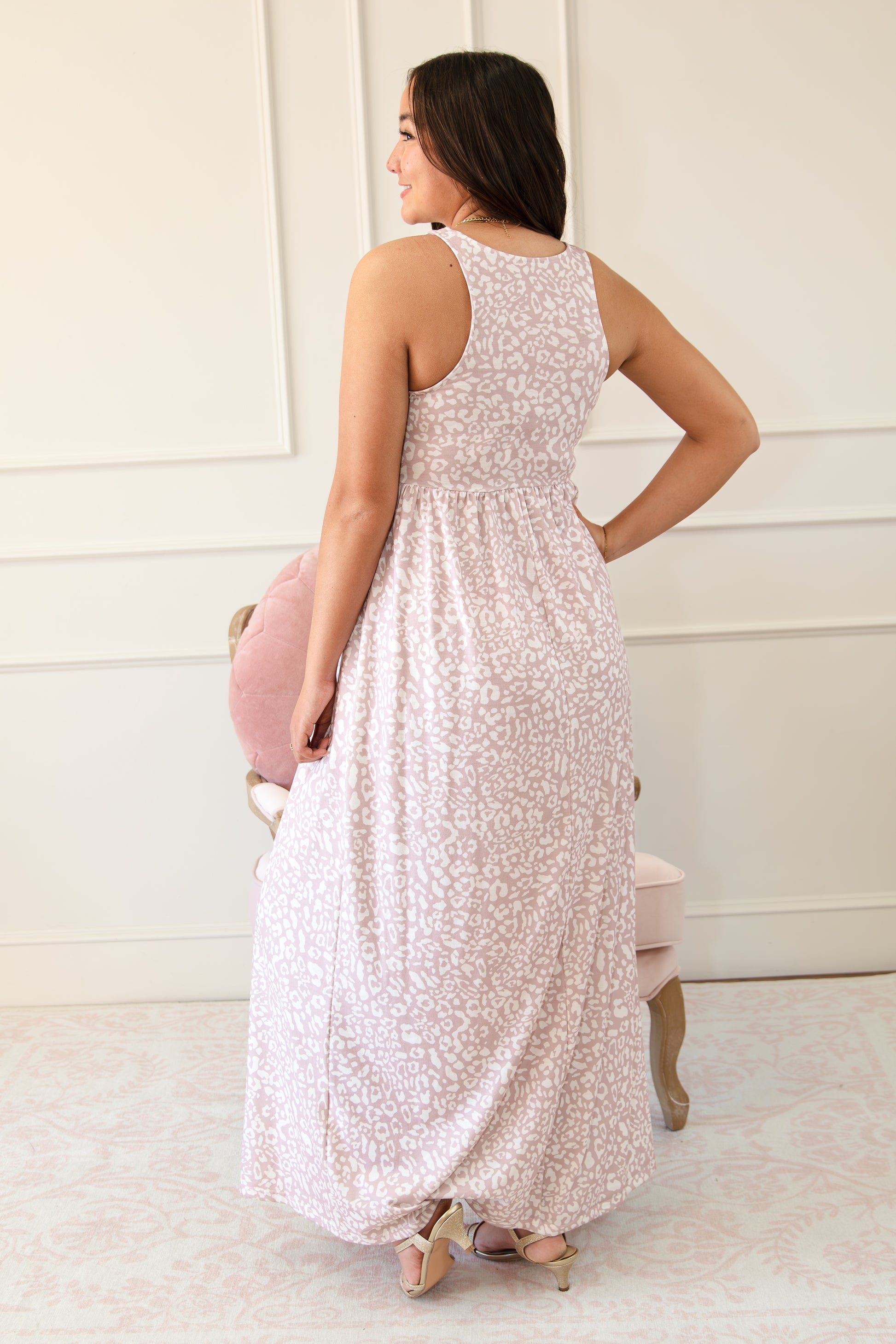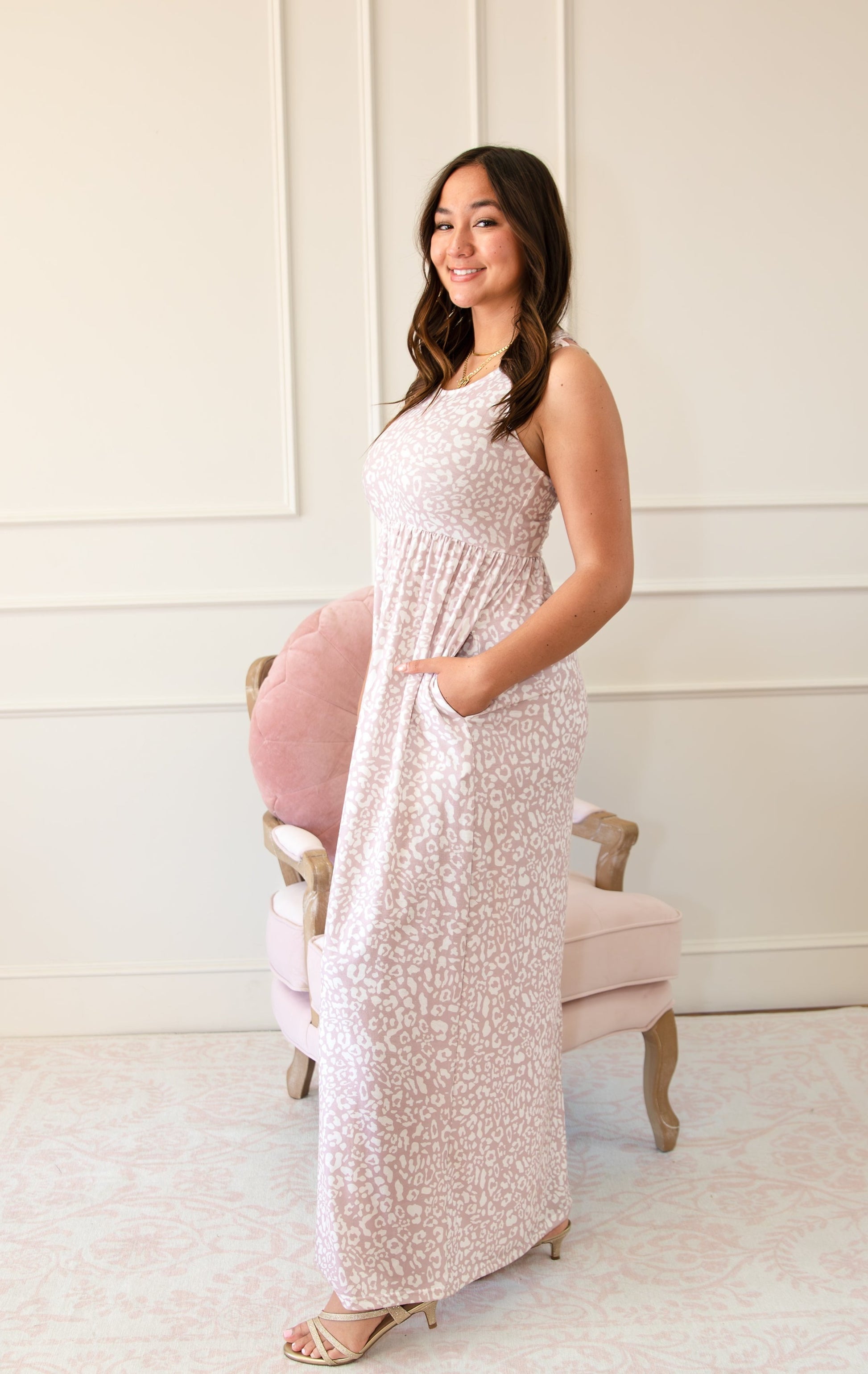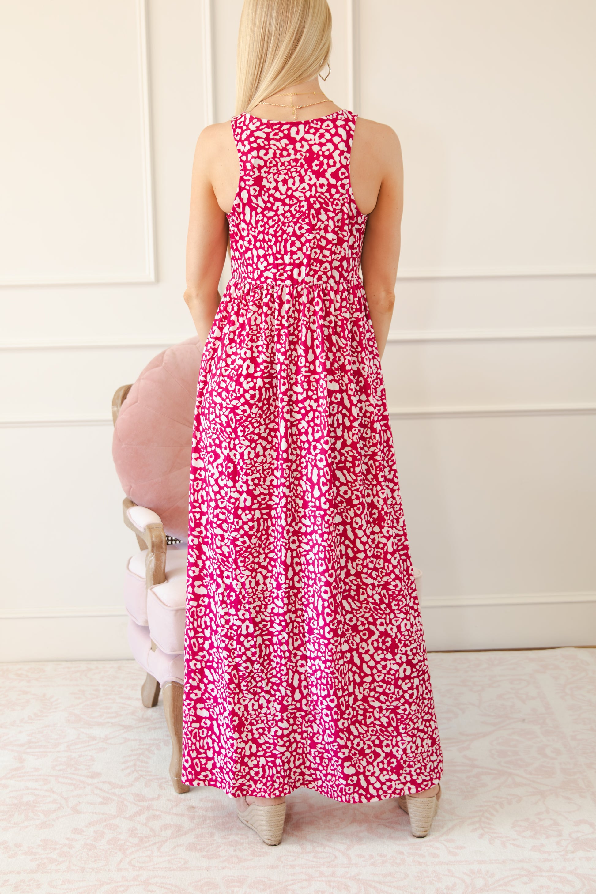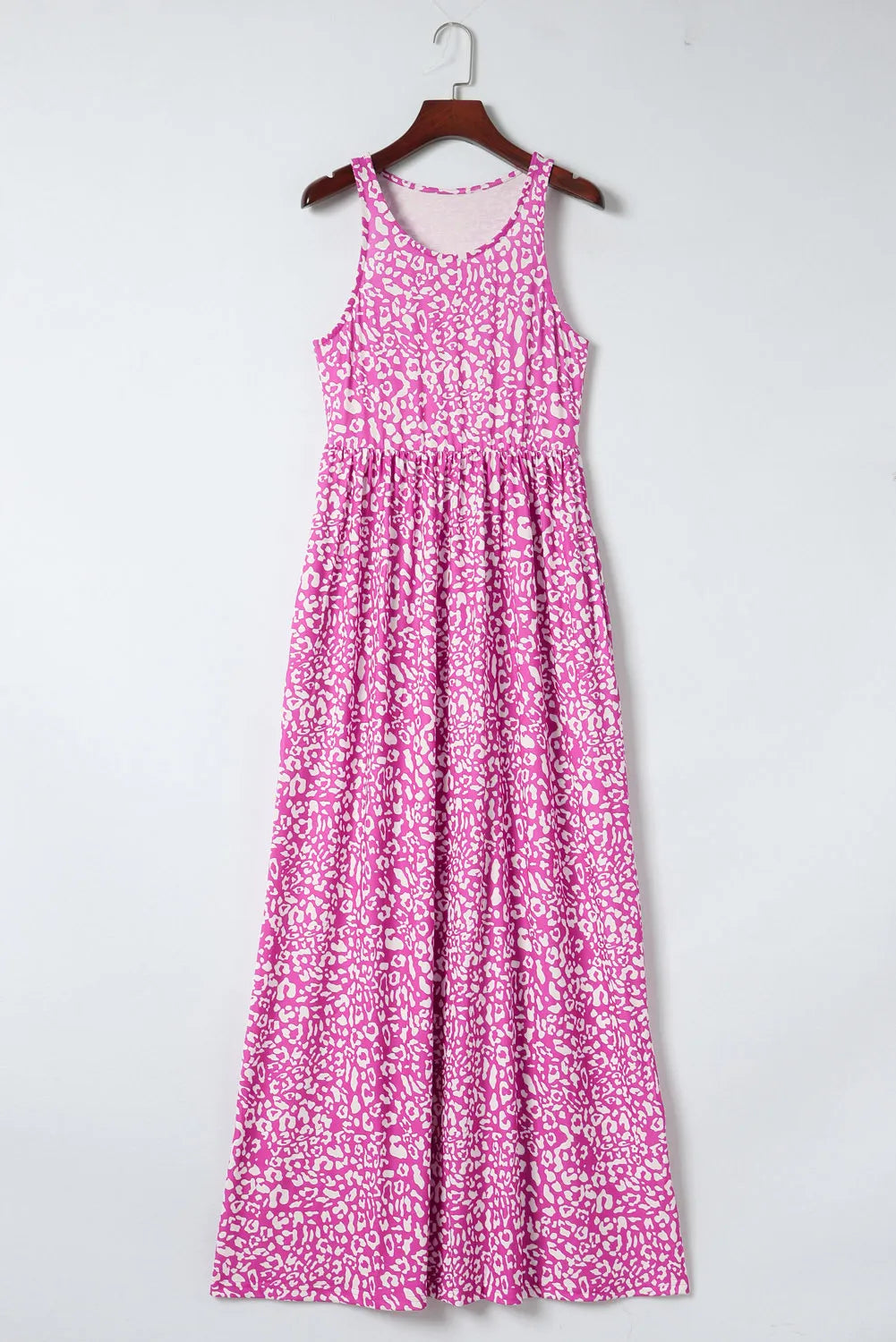 The Sleeveless Maxi Dress featuring a chic leopard print seamlessly blends fashion-forward style with convenience. Its striking leopard pattern brings a dash of flair, complemented by the sleeveless design perfect for sun-soaked days. The maxi length delivers a graceful and fluid silhouette, while the addition of two front pockets elevates its functionality. Made from a breezy and lightweight fabric, this dress promises comfort throughout those warm summer outings.