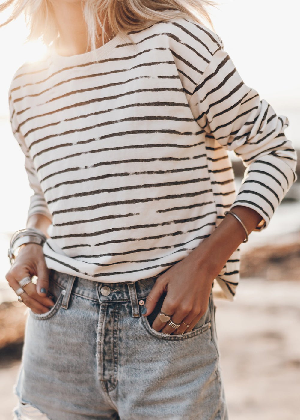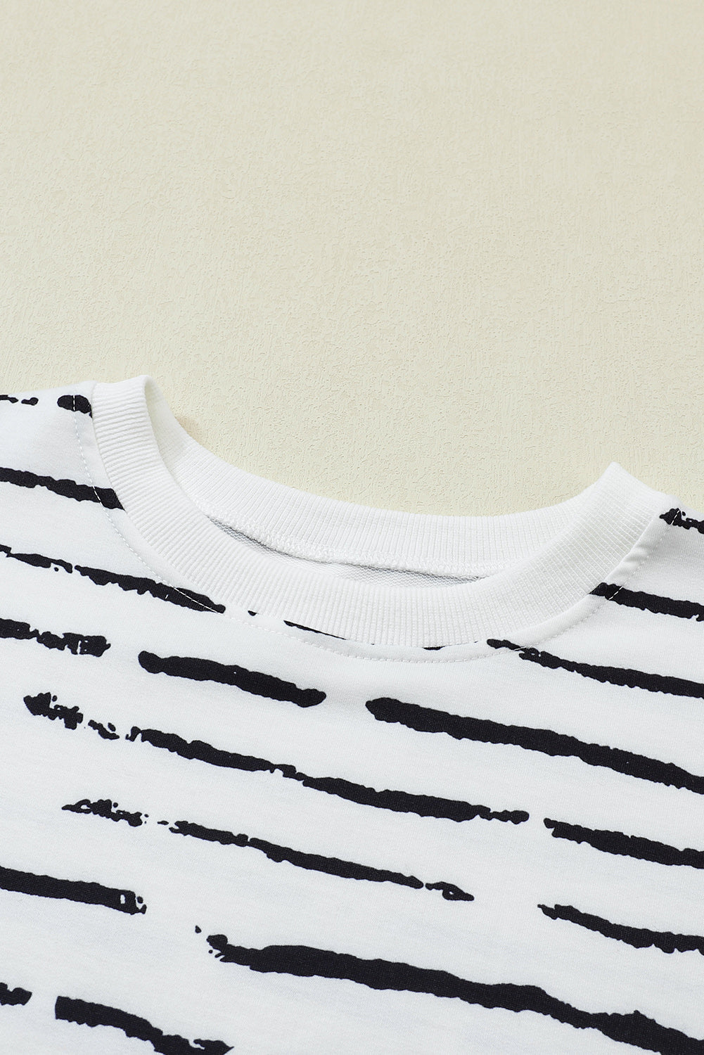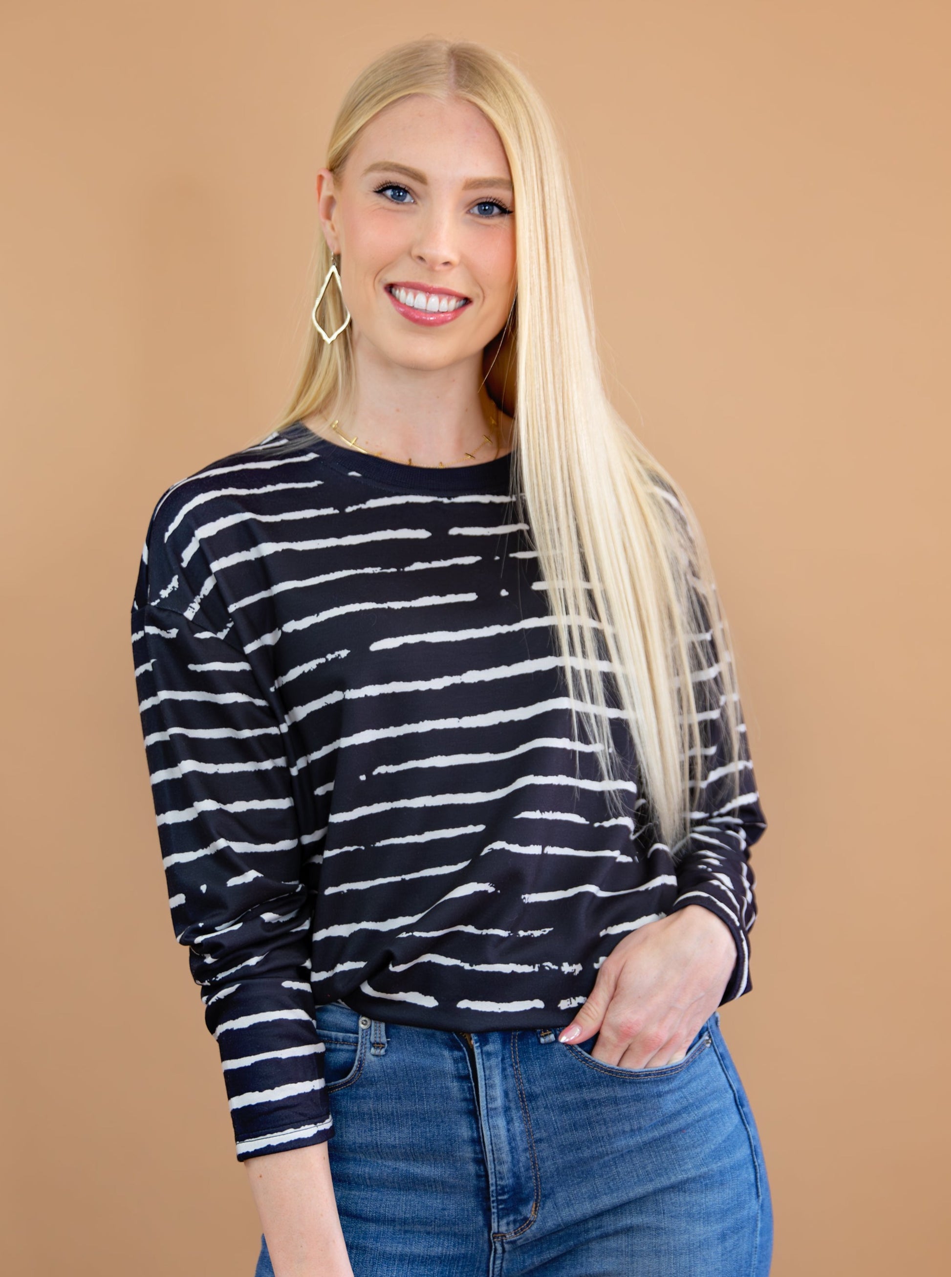 Combine retro allure with contemporary flair in this laid-back top, adorned with a timeless striped print. Effortlessly chic, the top showcases a flattering shift style designed to complement any body shape. Embrace both comfort and style with its relaxed fit and long sleeves. Crafted from high-quality fabric, this top ensures comfortable wear throughout the day.