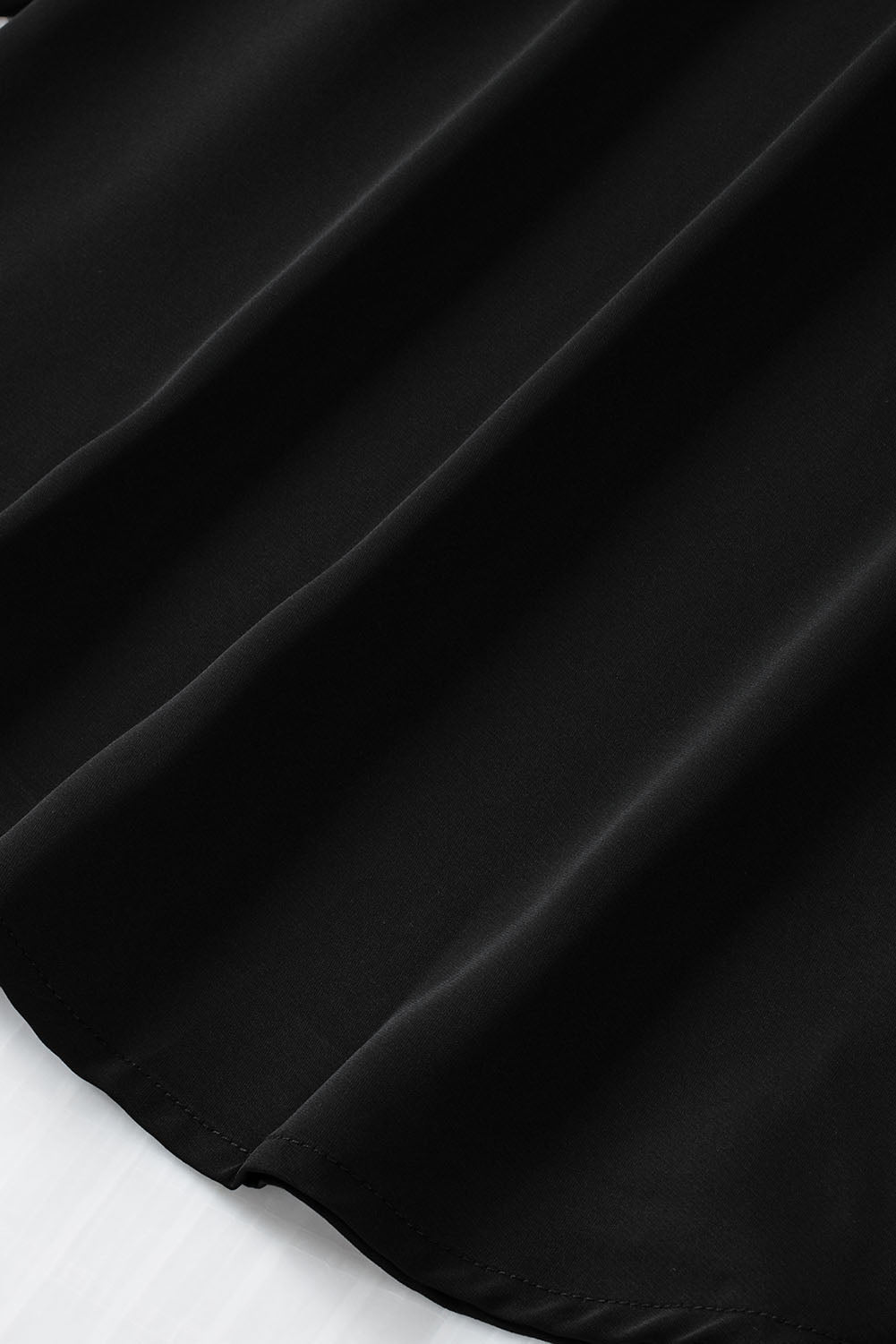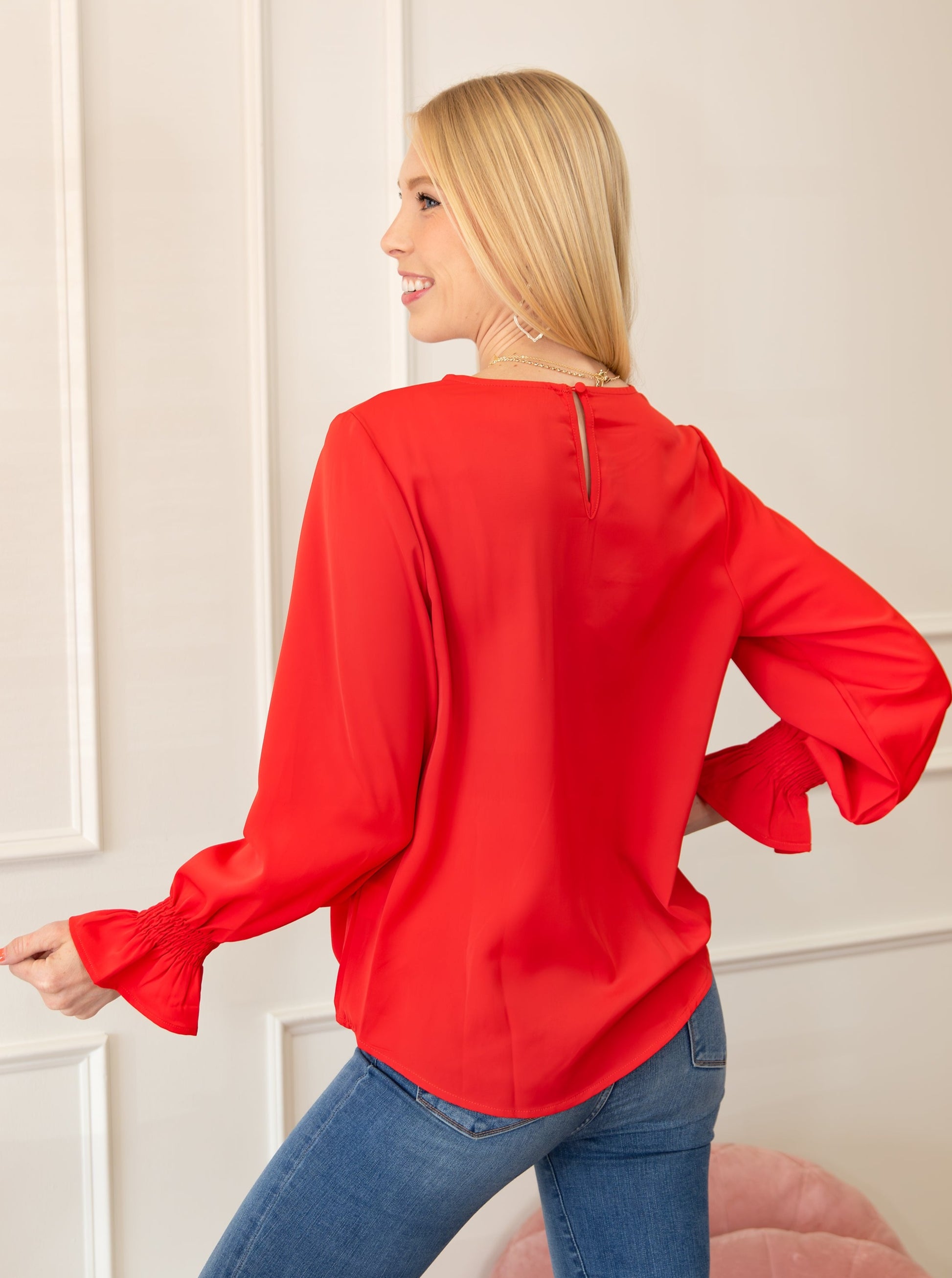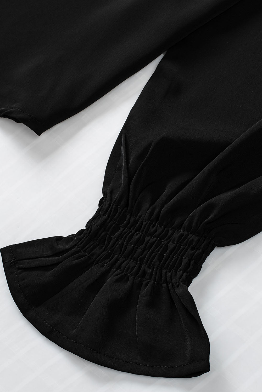 This long-sleeve top is a foolproof choice. It features a round neck, loose fit, and bubble sleeves with ruffled cuffs for a timeless look. The solid color and concise style make it a classic piece that pairs well with any jeans or skirts, showcasing its versatile style.
