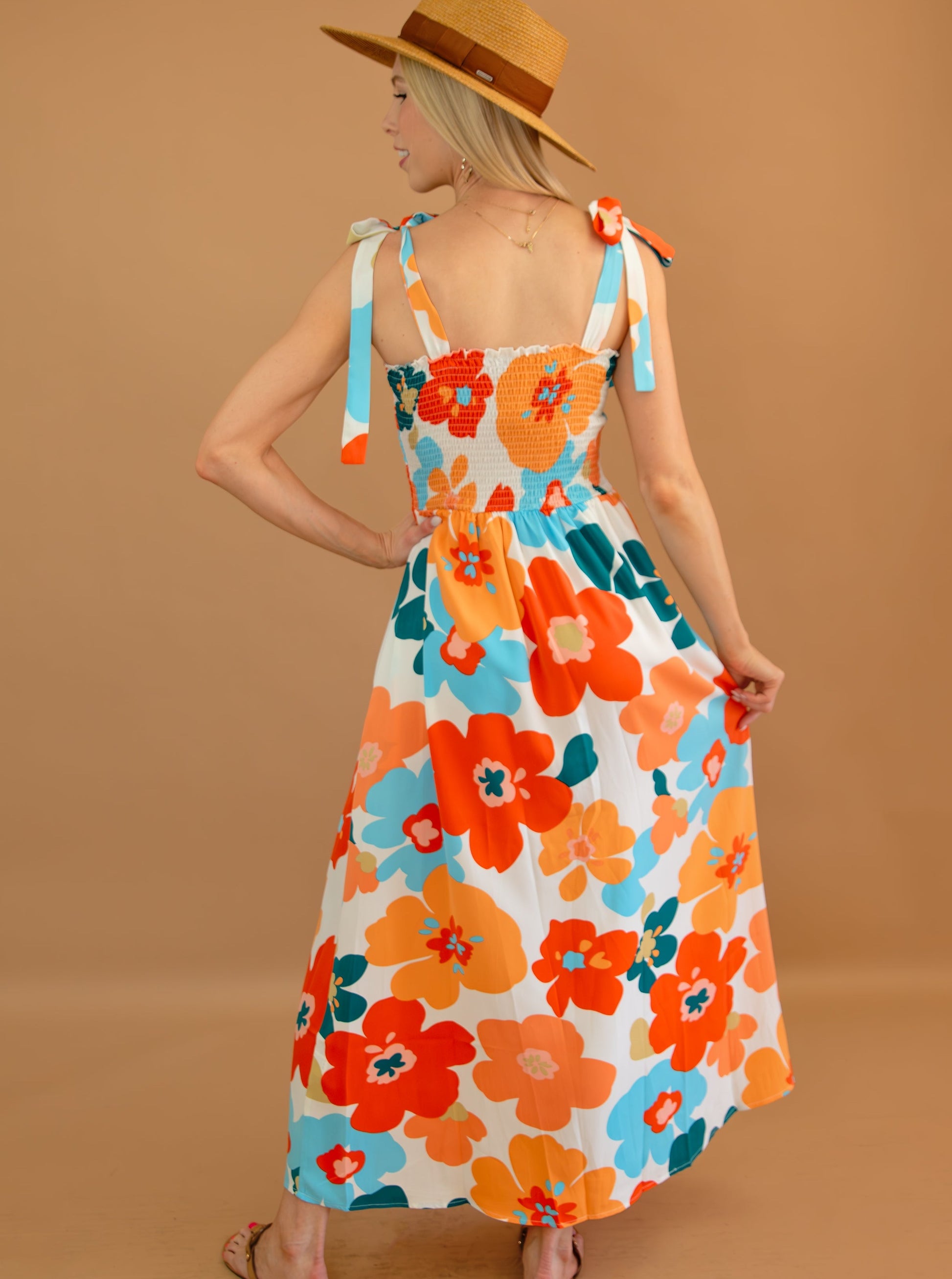 Illuminate your day in this radiant long floral dress. Crafted from lightweight, soft fabric adorned with a vibrant floral print, it features self-tie straps, a smocked bodice, and hidden pockets. The fitted bodice transitions into a flared skirt, creating a flattering silhouette that's both stylish and comfortable.