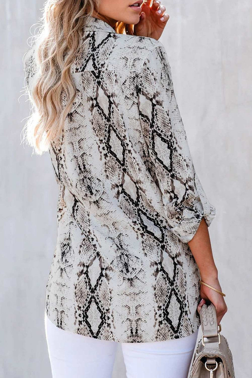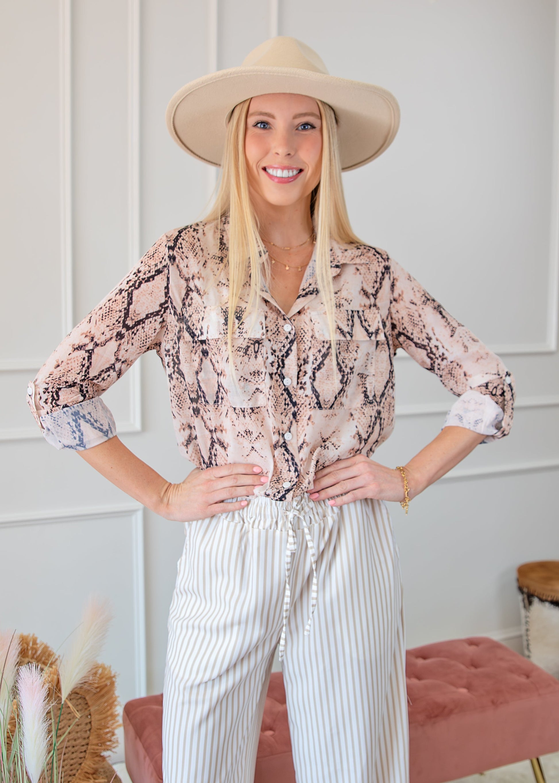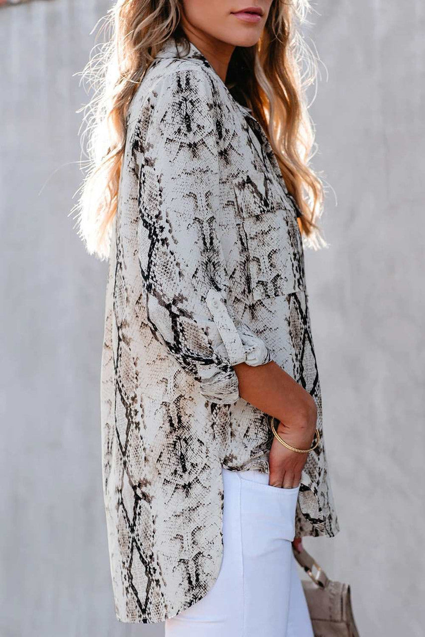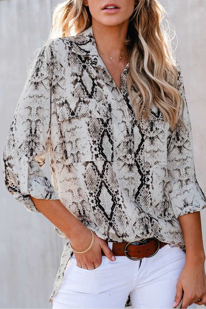 This airy and comfortable blouse has a relaxed fit that complements all body types. Featuring a split neckline, bust pockets, roll-up sleeves, and a high-low hem with a stylish split, these classic elements add simplicity to the design. The snake and leopard prints lend a cool and trendy vibe, perfect for a casual and fashionable look. Pair it with our "Stripe wide Leg adjustable drawstring waist pants", you will LOVE the look!