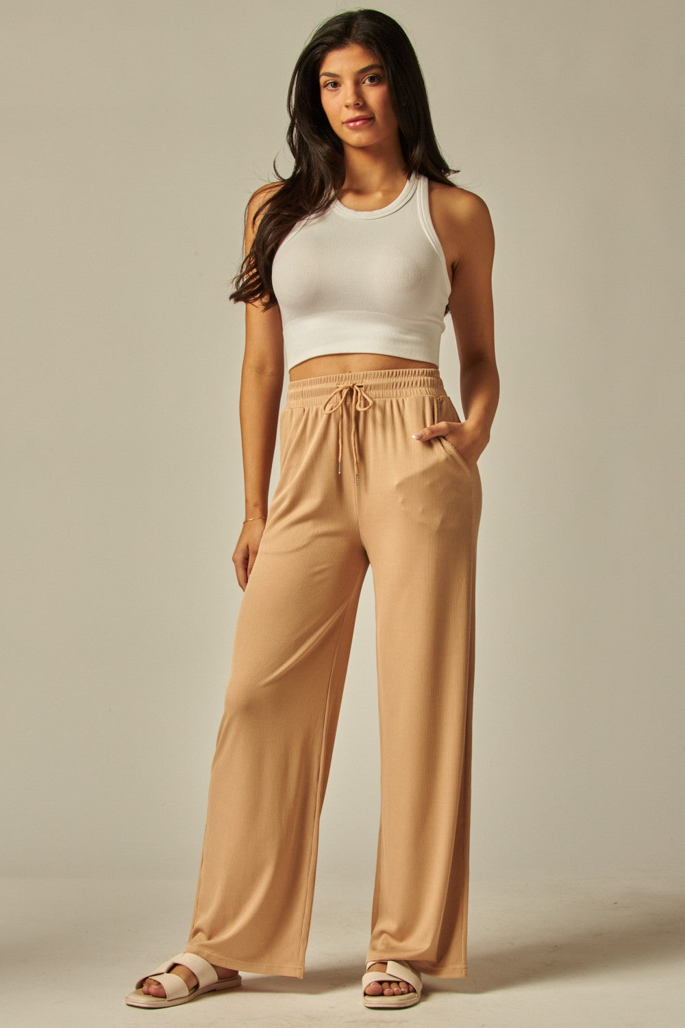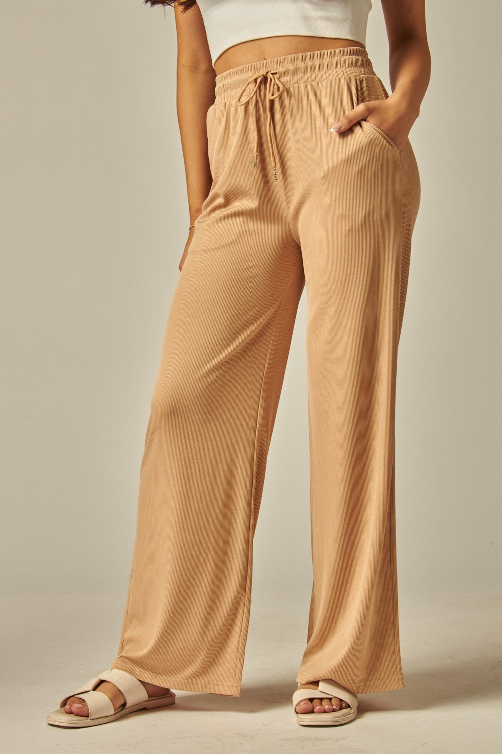 Stretchy Ribbed Drawstring Pocket Wide Leg Pants