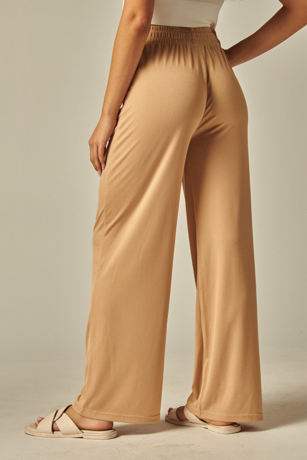 Stay comfortable and stylish in these fine ribbed, wide-leg pants designed with the perfect amount of stretch. Featuring an elastic waistband with a functional drawstring for a customizable fit, these pants also have two side pockets for added convenience. The soft, breathable fabric makes them ideal for lounging or running errands.