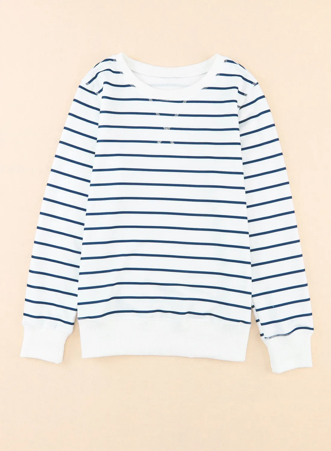 This long-sleeve top exudes simple chic with its timeless striped print. Featuring stylish ribbed trim on the cuffs, neckline, and hemline, it offers a comfortable and flattering fit for various body shapes. The versatile long sleeves make it suitable for all seasons, except for summer.