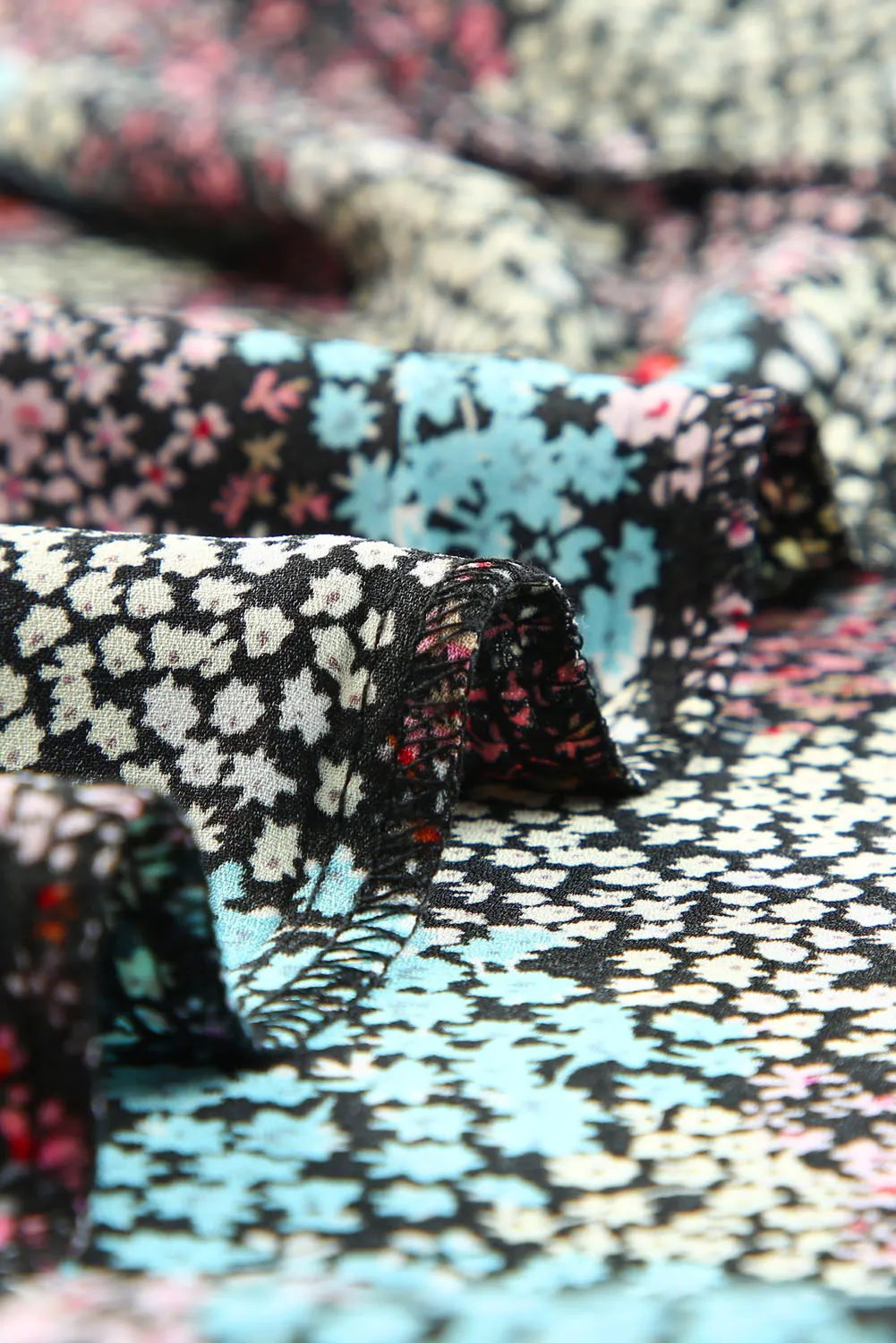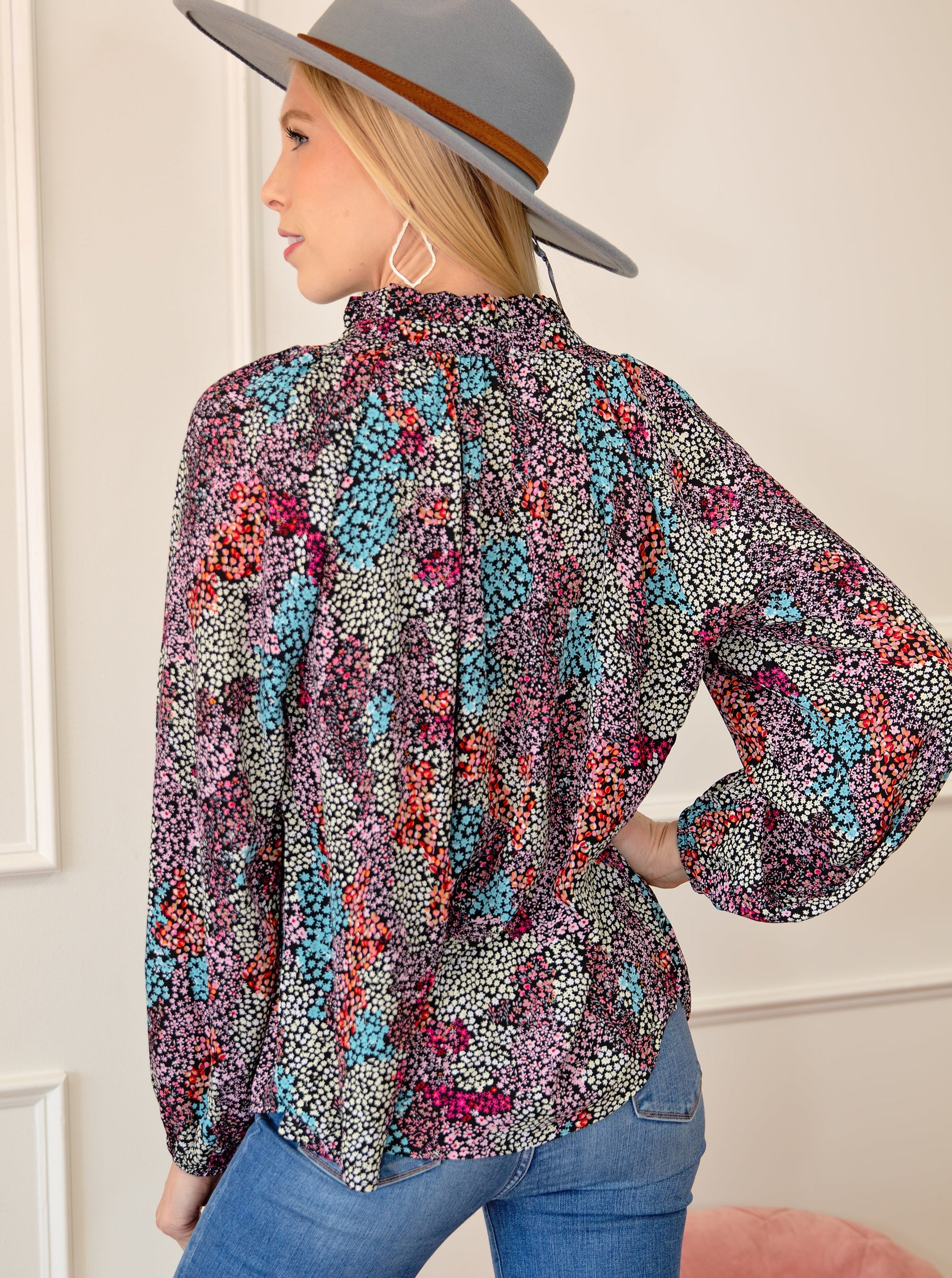 Embrace a vibrant lifestyle with this lively shift top, crafted from lightweight, flowing material and adorned with a colorful floral print. Featuring a v-cut neckline secured with a tie closure, along with long, loose, oversized bubble sleeves, this top exudes a relaxed silhouette that gracefully falls into a straight hemline.