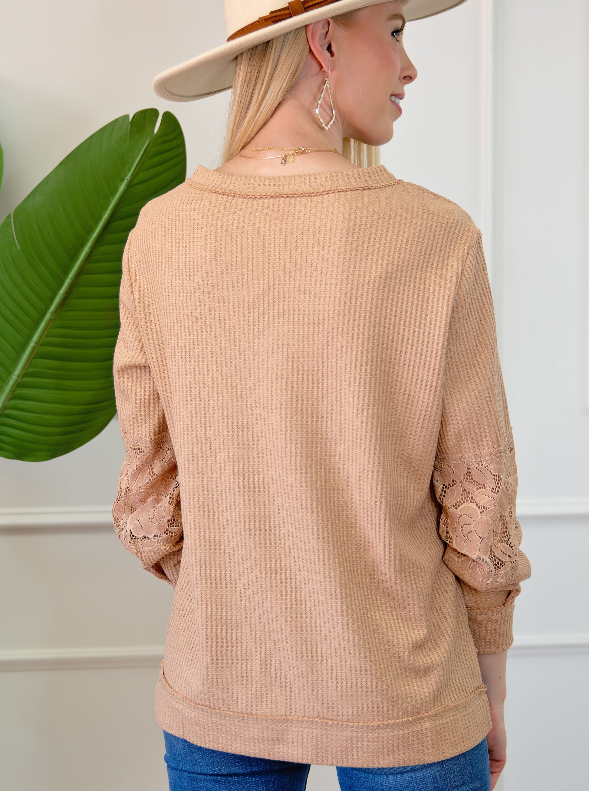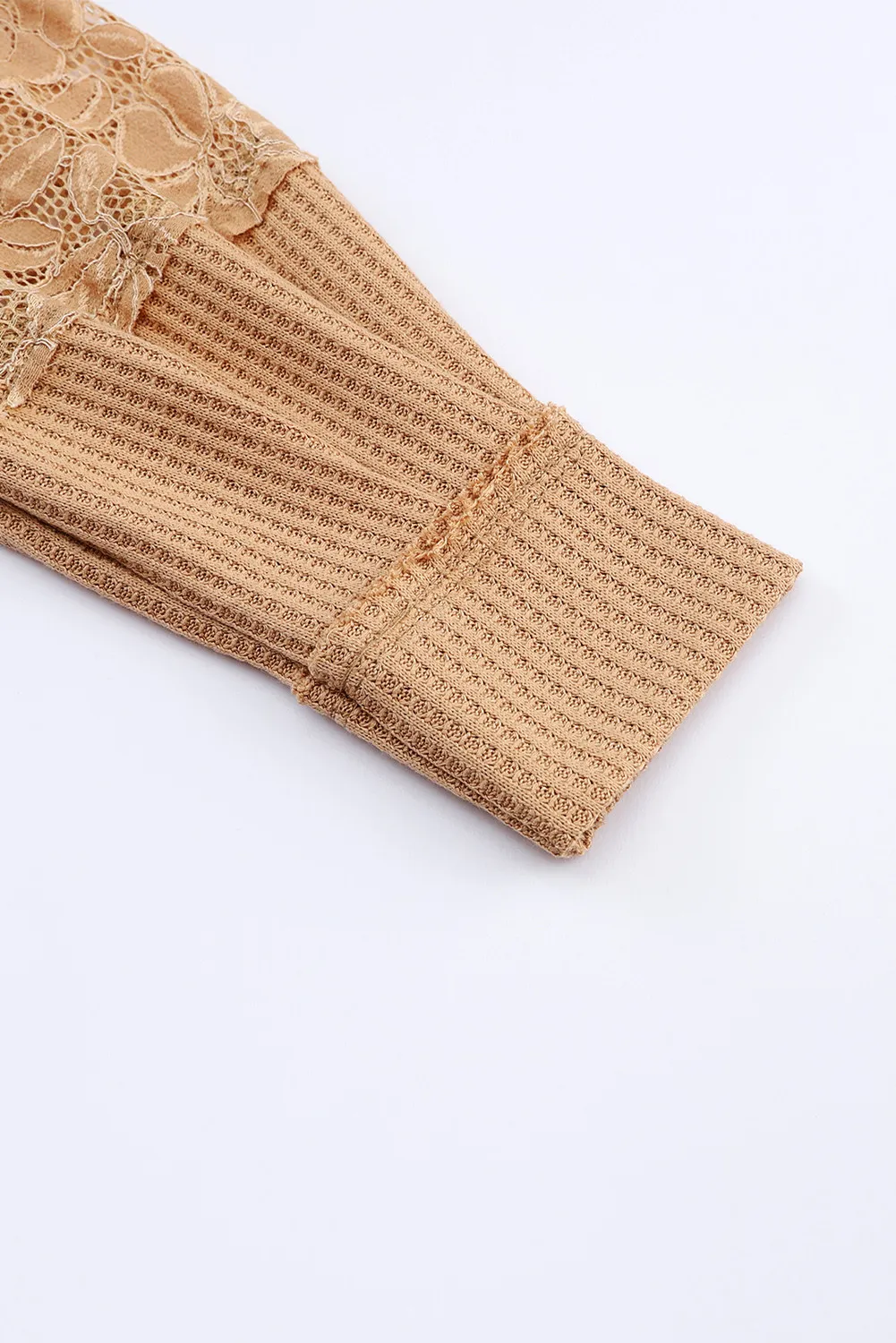 Waffle And Floral Lace Long Sleeve Top