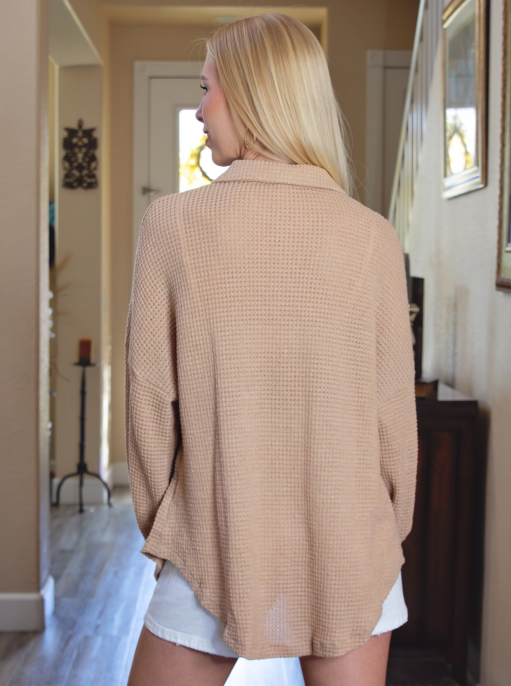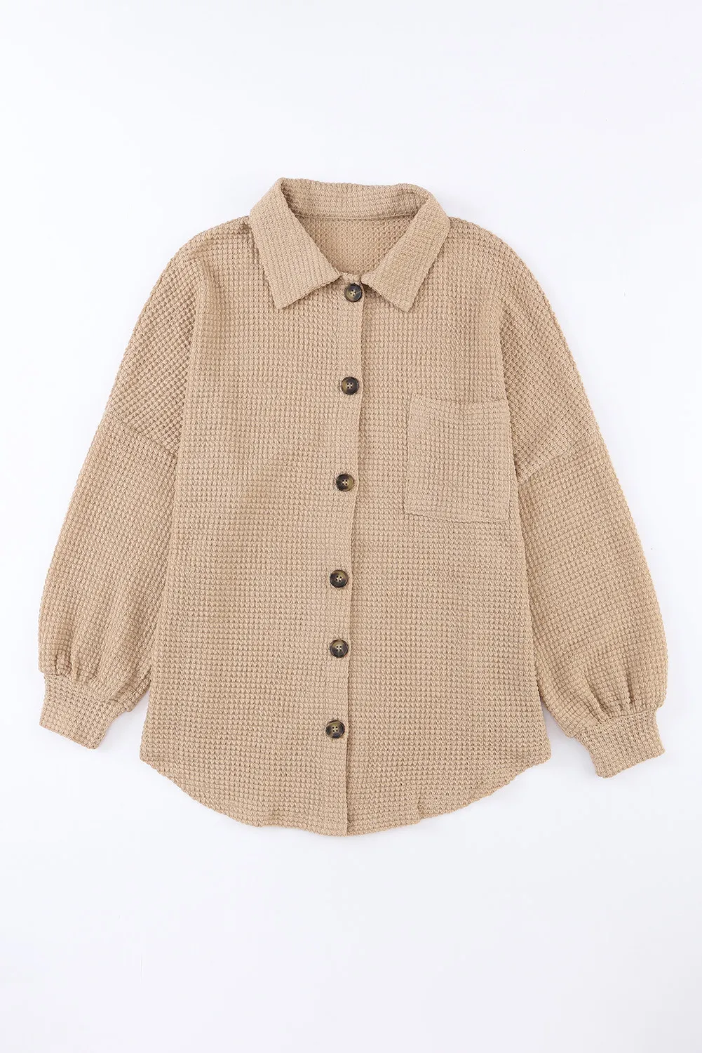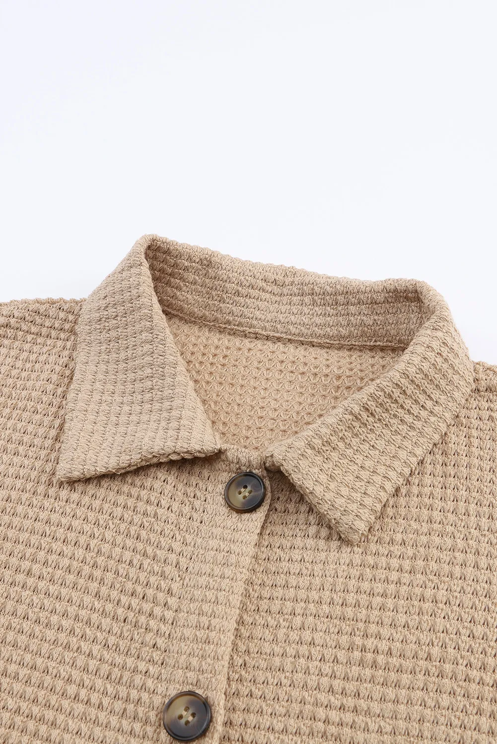Embrace a casual yet charming look with this textured knit blouse. Constructed from lightweight fabric featuring waffle knit detailing, it boasts a button-up front, collared neckline, drop shoulders, and a single accent chest pocket. The relaxed silhouette is designed with a slouchy feel, culminating in a rounded hemline for added style.