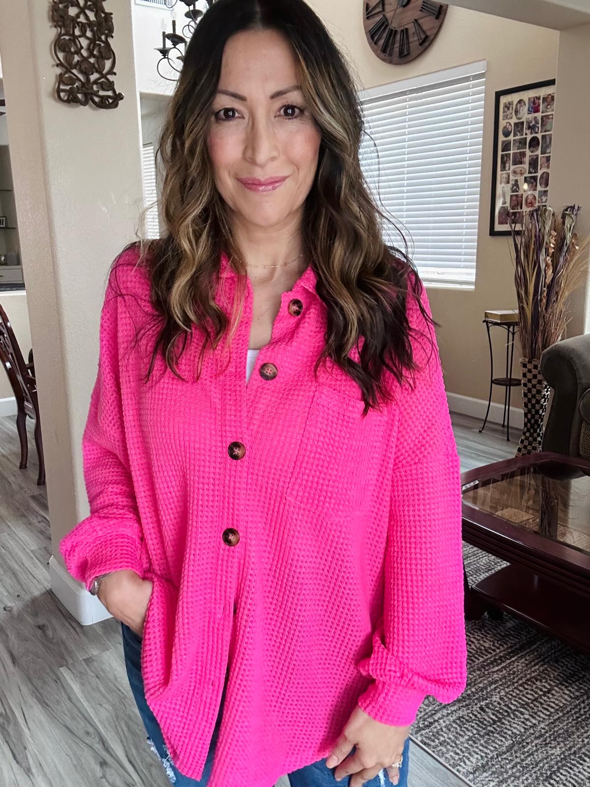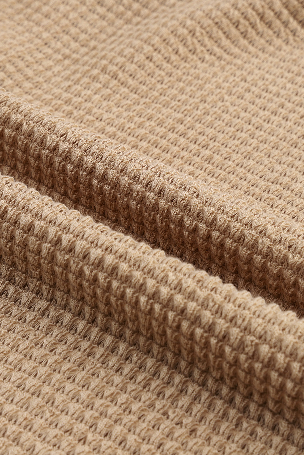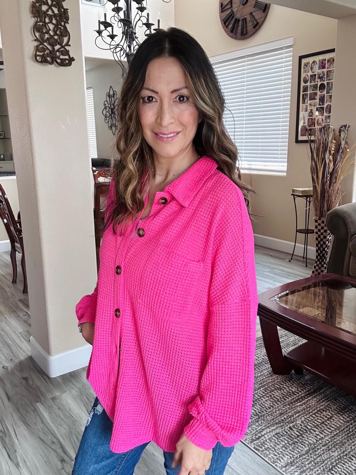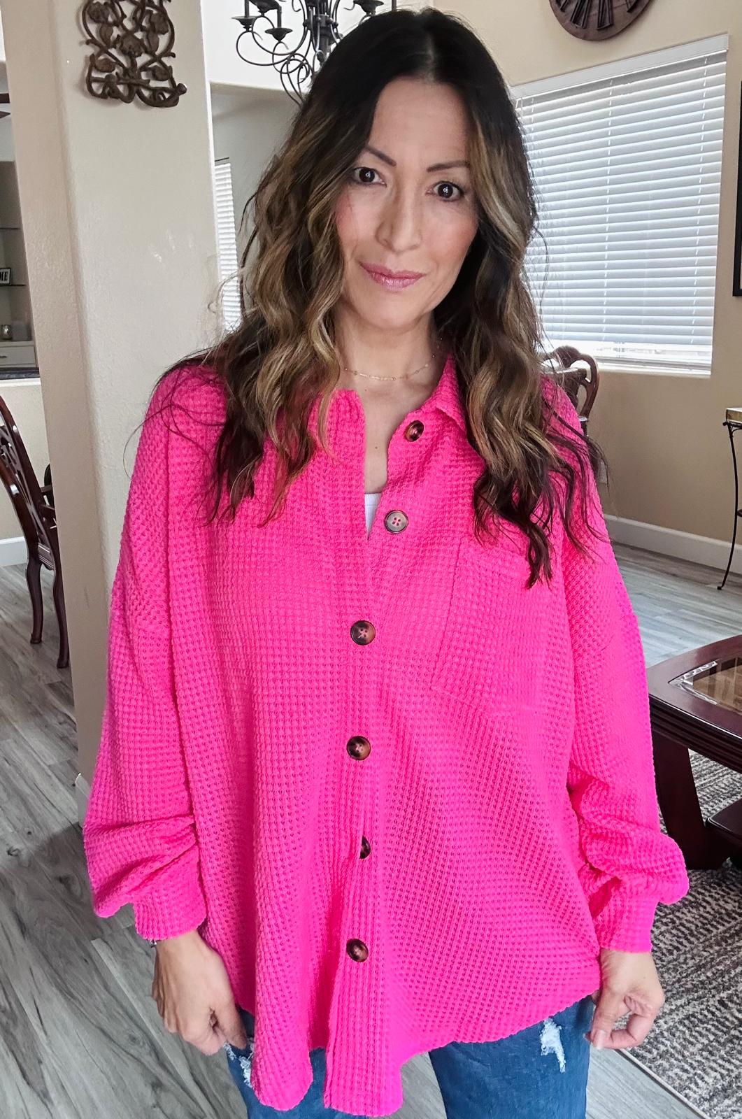 Embrace a casual yet charming look with this textured knit blouse. Constructed from lightweight fabric featuring waffle knit detailing, it boasts a button-up front, collared neckline, drop shoulders, and a single accent chest pocket. The relaxed silhouette is designed with a slouchy feel, culminating in a rounded hemline for added style.