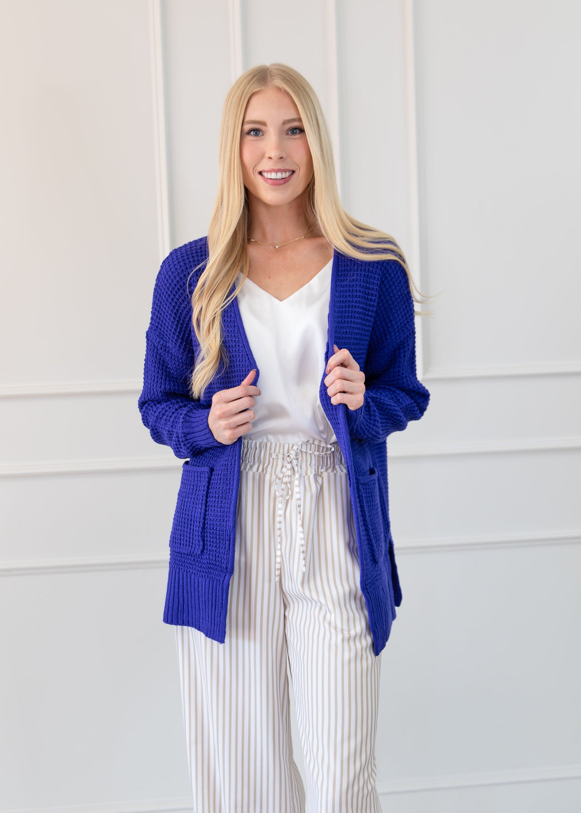 Stay cozy and look stunning in this cozy cardigan. It features a loose fit, waffle pattern, side slits and pockets. Whether you're looking for a stylish addition to your winter wardrobe, or just want something comfortable to layer with, this cardigan is the perfect choice!