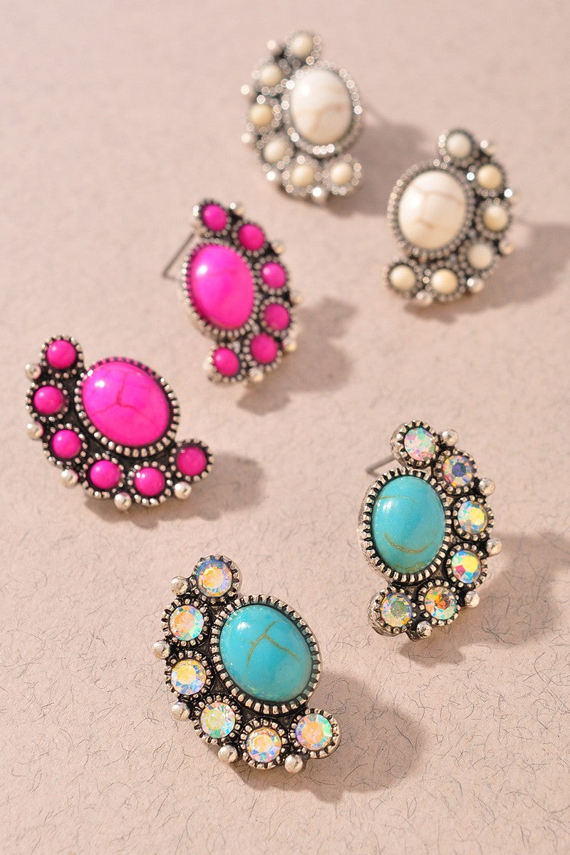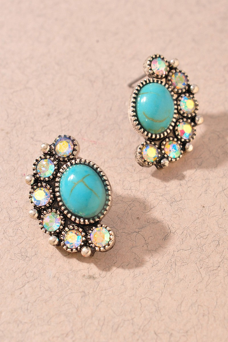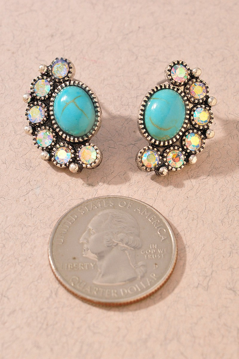 Add a touch of sparkle and Western flair to any outfit with our Western TQ Rhinestone Post Earrings. These eye catching studs feature a classic turquoise inspired center surrounded by shimmering rhinestones, creating the perfect mix of rustic charm and glam. Lightweight and easy to wear, they’re perfect for ever